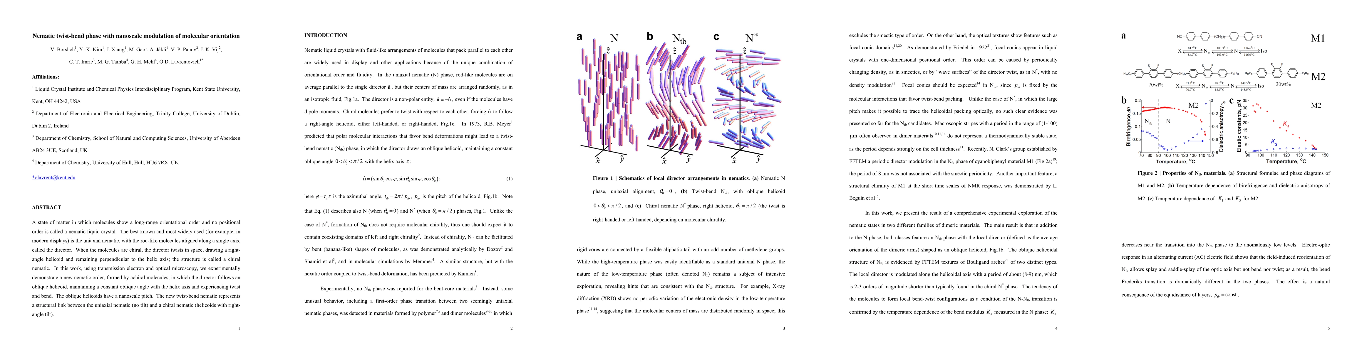 This research introduces a novel twist-bend nematic phase characterized by achiral molecules exhibiting an oblique helicoid structure with a nanoscale pitch, bridging the structural gap between uniaxial nematic and chiral nematic phases. The findings are demonstrated using advanced transmission electron and optical microscopy techniques.