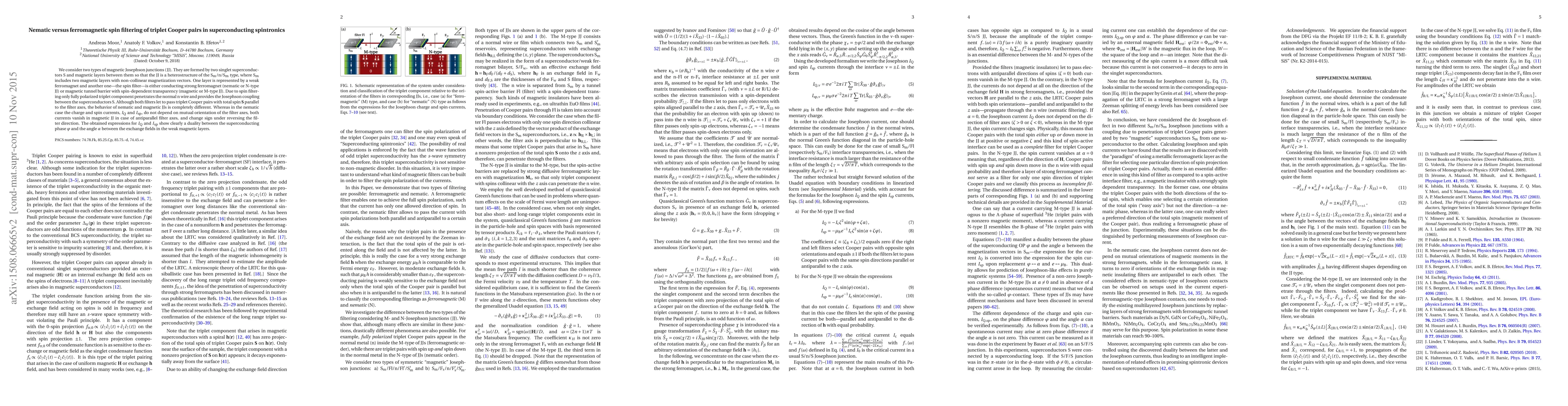 This paper investigates two types of magnetic Josephson junctions (JJ) that utilize different magnetic layers to filter triplet Cooper pairs in superconducting spintronics. The nematic JJ allows charge and spin currents independent of the filter axis orientation, while the magnetic JJ's currents vanish when filter axes are antiparallel and change sign with direction reversal, demonstrating a duality between the superconducting phase and the angle between exchange fields.