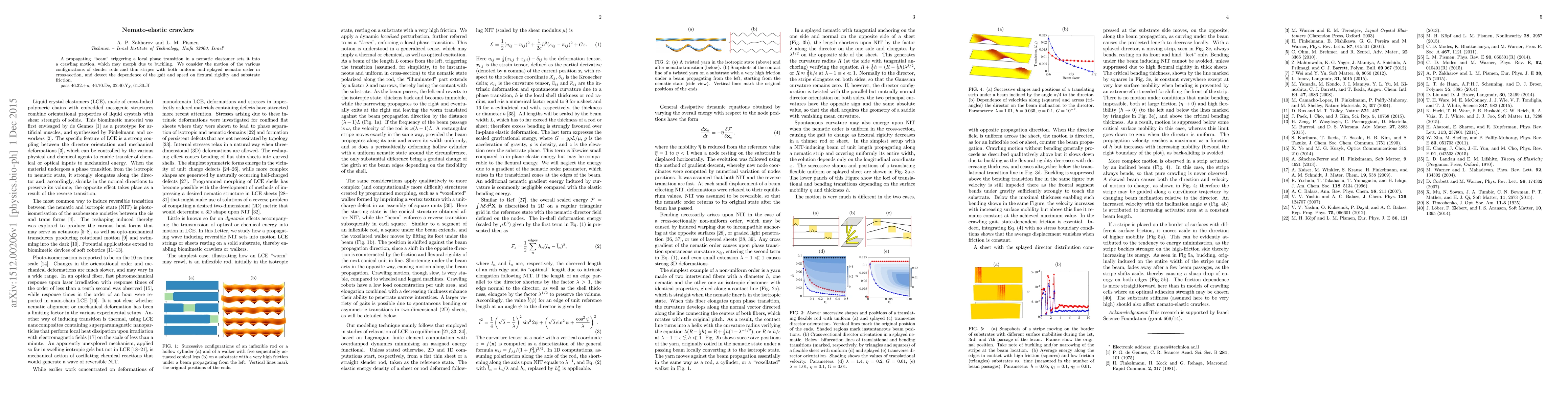 A propagating "beam" triggering a local phase transition in a nematic elastomer sets it into a crawling motion, which may morph due to buckling. We consider the motion of the various configurations of slender rods and thin stripes with both uniform and splayed nematic order in cross-section, and detect the dependence of the gait and speed on flexural rigidity and substrate friction.