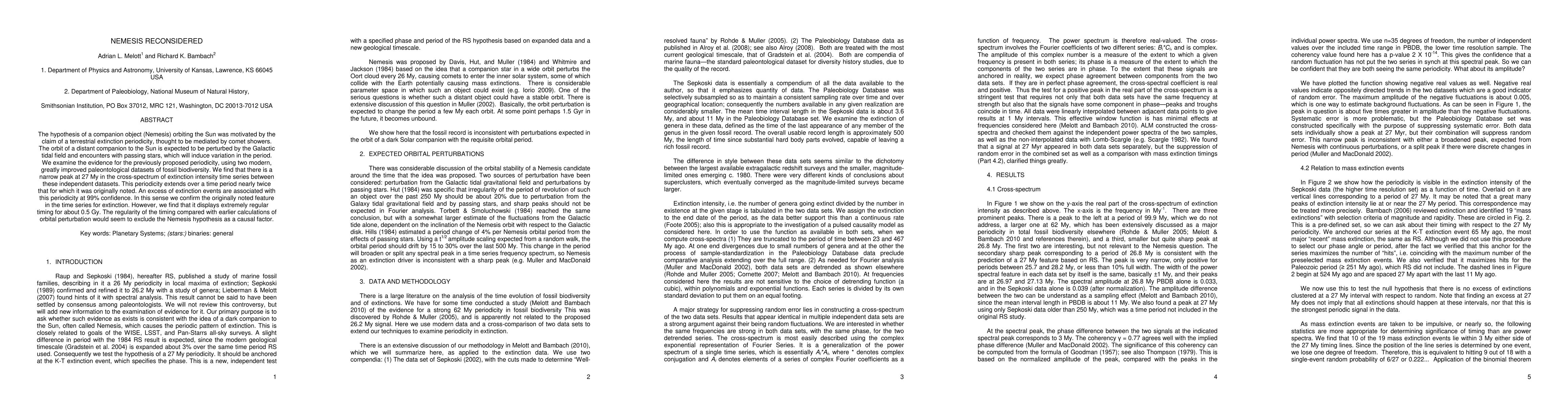 The hypothesis of a companion object (Nemesis) orbiting the Sun was motivated by the claim of a terrestrial extinction periodicity, thought to be mediated by comet showers. The orbit of a distant companion to the Sun is expected to be perturbed by the Galactic tidal field and encounters with passing stars, which will induce variation in the period. We examine the evidence for the previously proposed periodicity, using two modern, greatly improved paleontological datasets of fossil biodiversity. We find that there is a narrow peak at 27 My in the cross-spectrum of extinction intensity time series between these independent datasets. This periodicity extends over a time period nearly twice that for which it was originally noted. An excess of extinction events are associated with this periodicity at 99% confidence. In this sense we confirm the originally noted feature in the time series for extinction. However, we find that it displays extremely regular timing for about 0.5 Gy. The regularity of the timing compared with earlier calculations of orbital perturbation would seem to exclude the Nemesis hypothesis as a causal factor.