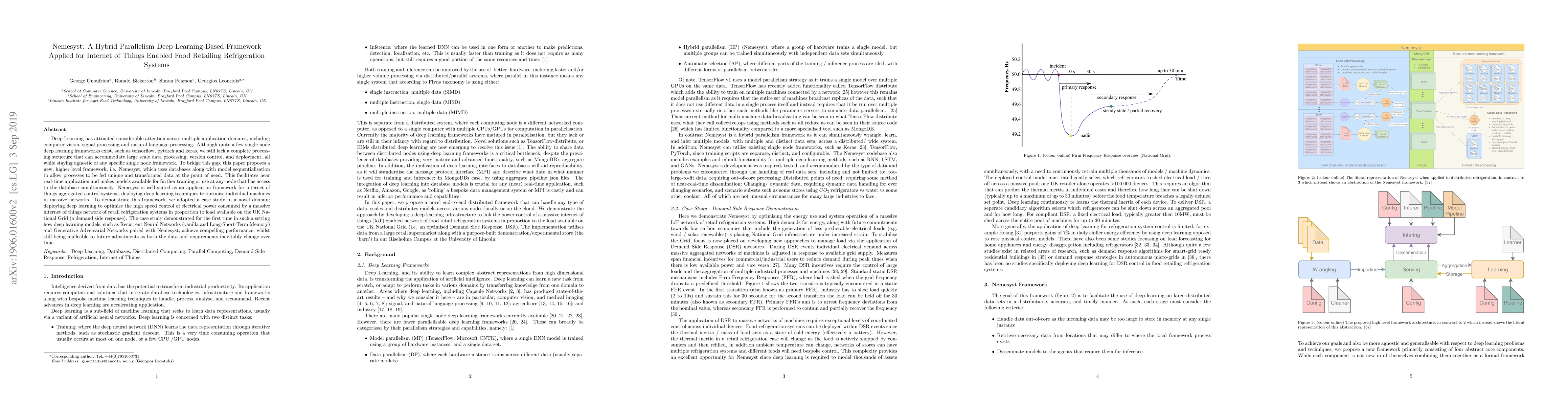 Nemesyst is a hybrid parallelism deep learning framework designed to optimize large-scale data processing and deployment in IoT-enabled food retailing refrigeration systems. It leverages databases and model sequentialisation for real-time application and simultaneous training, demonstrating effective optimization of electrical power consumption in a UK National Grid demand side response.