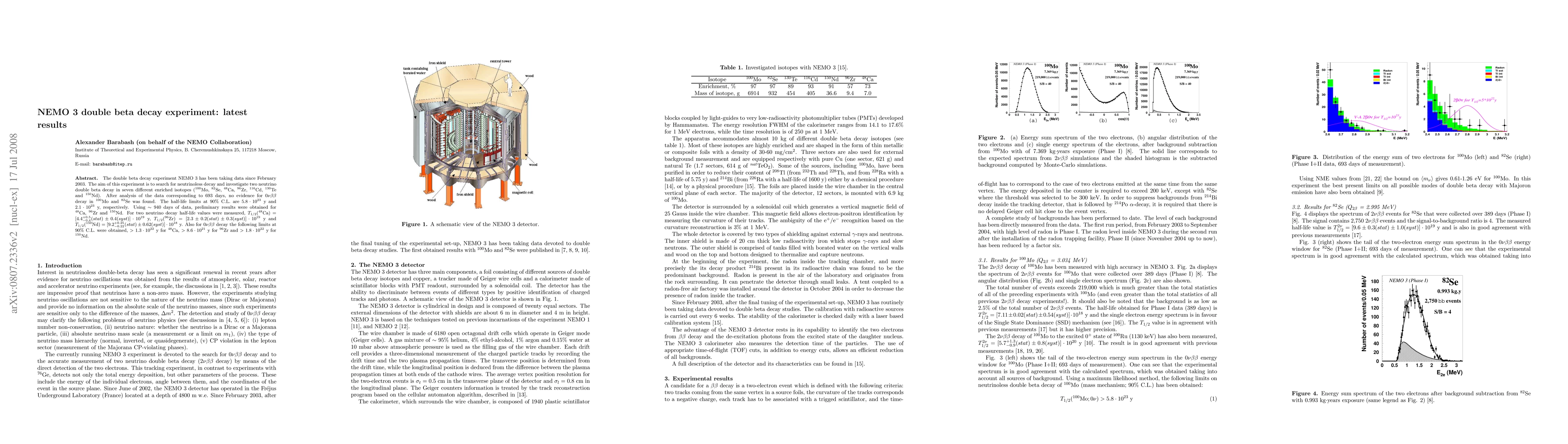The double beta decay experiment NEMO~3 has been taking data since February 2003. The aim of this experiment is to search for neutrinoless decay and investigate two neutrino double beta decay in seven different enriched isotopes ($^{100}$Mo,$^{82}$Se, $^{48}$Ca, $^{96}$Zr, $^{116}$Cd, $^{130}$Te and $^{150}$Nd). After analysis of the data corresponding to 693 days, no evidence for $0\nu\beta\beta$ decay in $^{100}$Mo and $^{82}$Se was found. The half-life limits at 90% C.L. are $5.8\cdot 10^{23}$ y and $2.1\cdot 10^{23}$ y, respectively. Using $\sim$ 940 days of data, preliminary results were obtained for $^{48}$Ca, $^{96}$Zr and $^{150}$Nd. For two neutrino decay half-life values were measured, $T_{1/2}(^{48}{\rm Ca}) = [4.4^{+0.5}_{-0.4}(stat) \pm 0.4(syst)] \cdot 10^{19}$ y, $T_{1/2}(^{96}{\rm Zr}) = [2.3 \pm 0.2(stat) \pm 0.3(syst)] \cdot 10^{19}$ y and $T_{1/2}(^{150}{\rm Nd}) = [9.2^{+0.25}_{-0.22}(stat) \pm 0.62(syst)] \cdot 10^{18}$ y. Also for $0\nu\beta\beta$ decay the following limits at 90% C.L. were obtained, $> 1.3 \cdot 10^{22}$ y for $^{48}$Ca, $> 8.6 \cdot 10^{21}$ y for $^{96}$Zr and > 1.8 \cdot 10^{22}$ y for $^{150}$Nd.