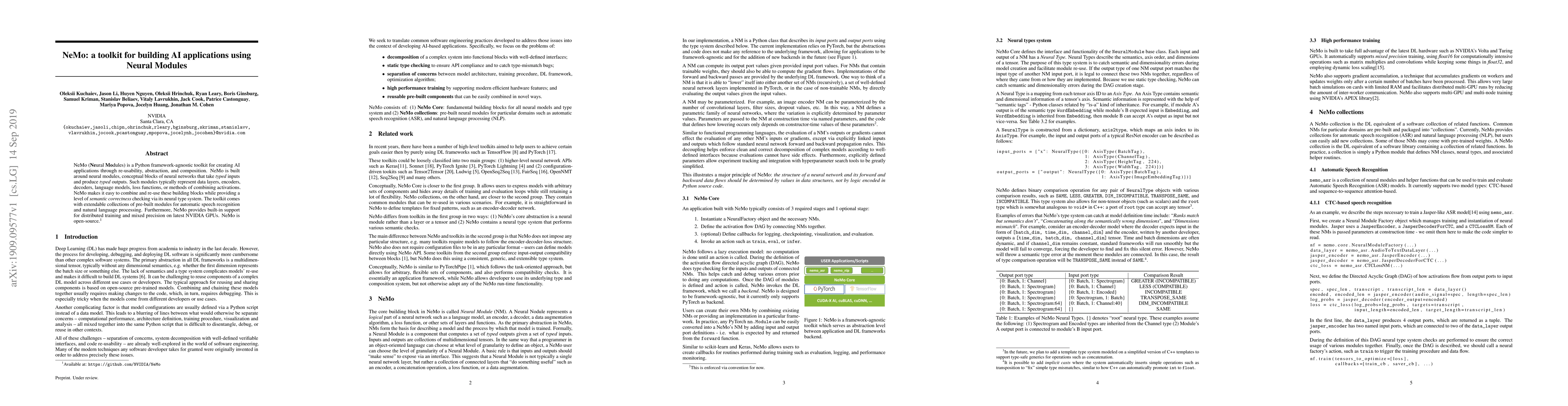 NeMo (Neural Modules) is a Python framework-agnostic toolkit for creating AI applications through re-usability, abstraction, and composition. NeMo is built around neural modules, conceptual blocks of neural networks that take typed inputs and produce typed outputs. Such modules typically represent data layers, encoders, decoders, language models, loss functions, or methods of combining activations. NeMo makes it easy to combine and re-use these building blocks while providing a level of semantic correctness checking via its neural type system. The toolkit comes with extendable collections of pre-built modules for automatic speech recognition and natural language processing. Furthermore, NeMo provides built-in support for distributed training and mixed precision on latest NVIDIA GPUs. NeMo is open-source https://github.com/NVIDIA/NeMo