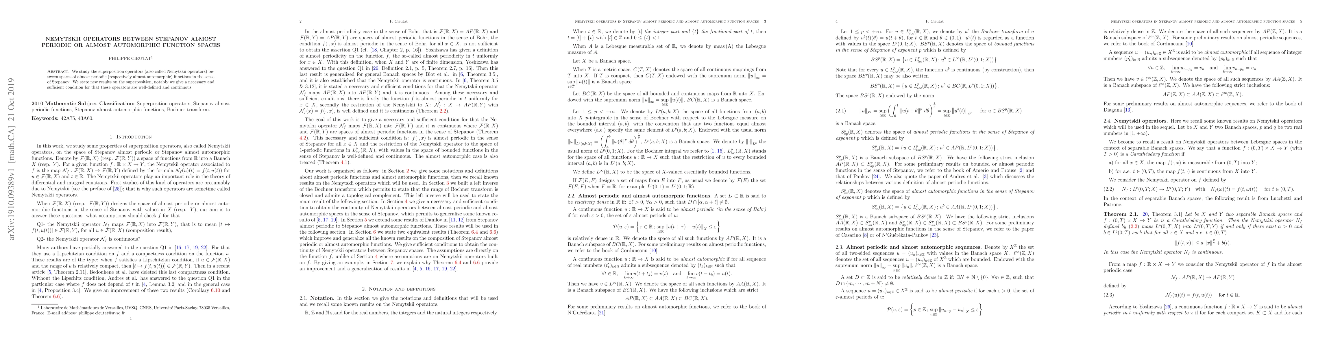 We study the superposition operators (also called Nemytskii operators) between spaces of almost periodic (respectively almost automorphic) functions in the sense of Stepanov. We state new results on the superposition, notably we give a necessary and sufficient condition for that these operators are well-defined and continuous.