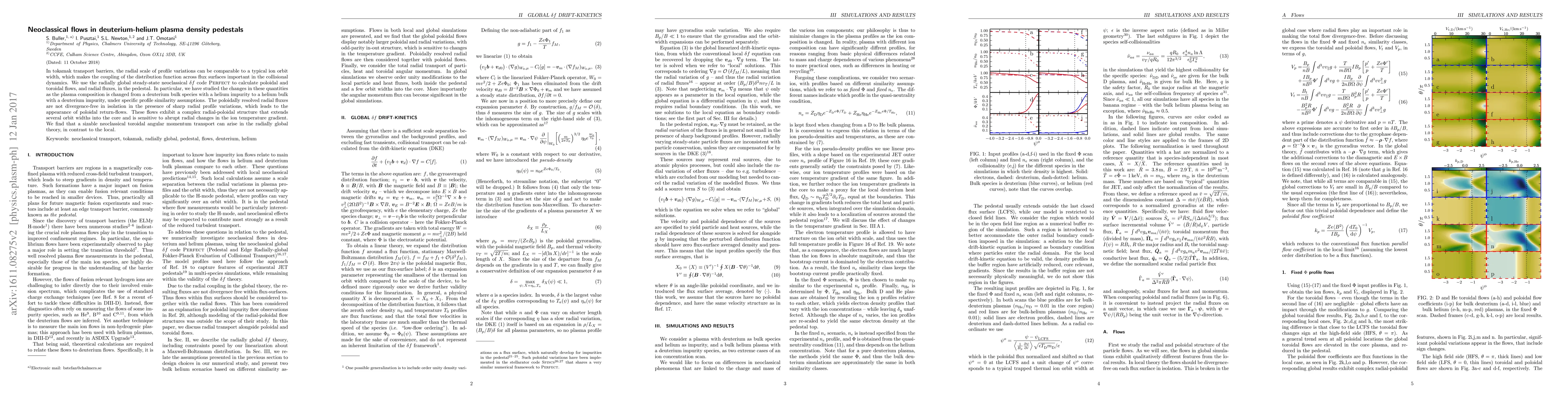 In tokamak transport barriers, the radial scale of profile variations can be comparable to a typical ion orbit width, which makes the coupling of the distribution function across flux surfaces important in the collisional dynamics. We use the radially global steady-state neoclassical {\delta}f code Perfect to calculate poloidal and toroidal flows, and radial fluxes, in the pedestal. In particular, we have studied the changes in these quantities as the plasma composition is changed from a deuterium bulk species with a helium impurity to a helium bulk with a deuterium impurity, under specific profile similarity assumptions. The poloidally resolved radial fluxes are not divergence-free in isolation in the presence of sharp radial profile variations, which leads to the appearance of poloidal return-flows. These flows exhibit a complex radial-poloidal structure that extends several orbit widths into the core and is sensitive to abrupt radial changes in the ion temperature gradient. We find that a sizable neoclassical toroidal angular momentum transport can arise in the radially global theory, in contrast to the local.