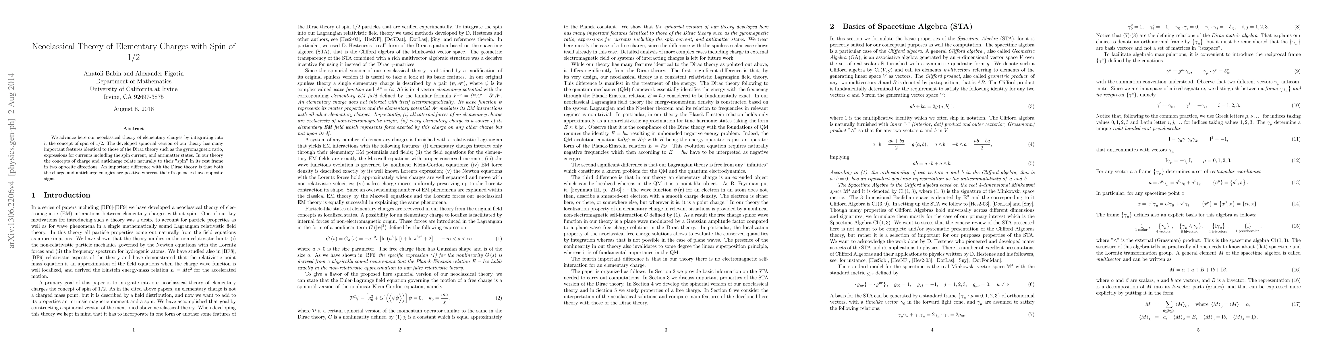 We advance here our neoclassical theory of elementary charges by integrating into it the concept of spin of 1/2. The developed spinorial version of our theory has many important features identical to those of the Dirac theory such as the gyromagnetic ratio, expressions for currents including the spin current, and antimatter states. In our theory the concepts of charge and anticharge relate naturally to their "spin" in its rest frame in two opposite directions. An important difference with the Dirac theory is that both the charge and anticharge energies are positive whereas their frequencies have opposite signs.