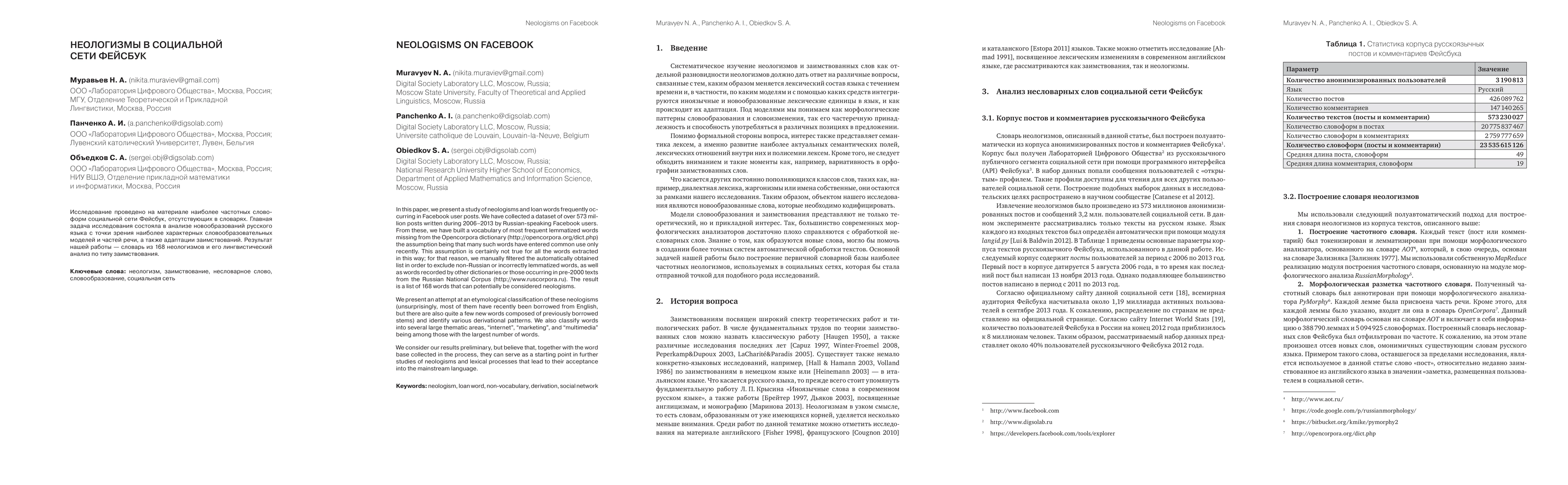 This paper analyzes neologisms and loan words in Russian-speaking Facebook posts from 2006-2013, identifying 168 potential neologisms through dataset analysis and manual filtering. The study classifies these neologisms etymologically and thematically, highlighting recent borrowings from English and new word formations.