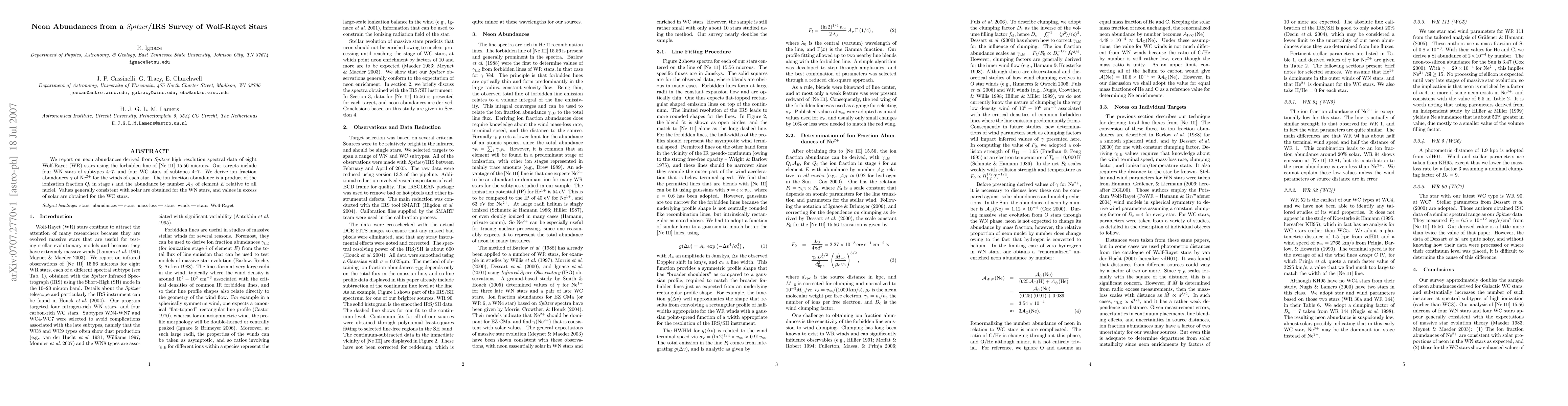 We report on neon abundances derived from {\it Spitzer} high resolution spectral data of eight Wolf-Rayet (WR) stars using the forbidden line of [\ion{Ne}{3}] 15.56 microns. Our targets include four WN stars of subtypes 4--7, and four WC stars of subtypes 4--7. We derive ion fraction abundances $\gamma$ of Ne^{2+} for the winds of each star. The ion fraction abundance is a product of the ionization fraction $Q_{\rm i}$ in stage i and the abundance by number ${\cal A}_E$ of element E relative to all nuclei. Values generally consistent with solar are obtained for the WN stars, and values in excess of solar are obtained for the WC stars.