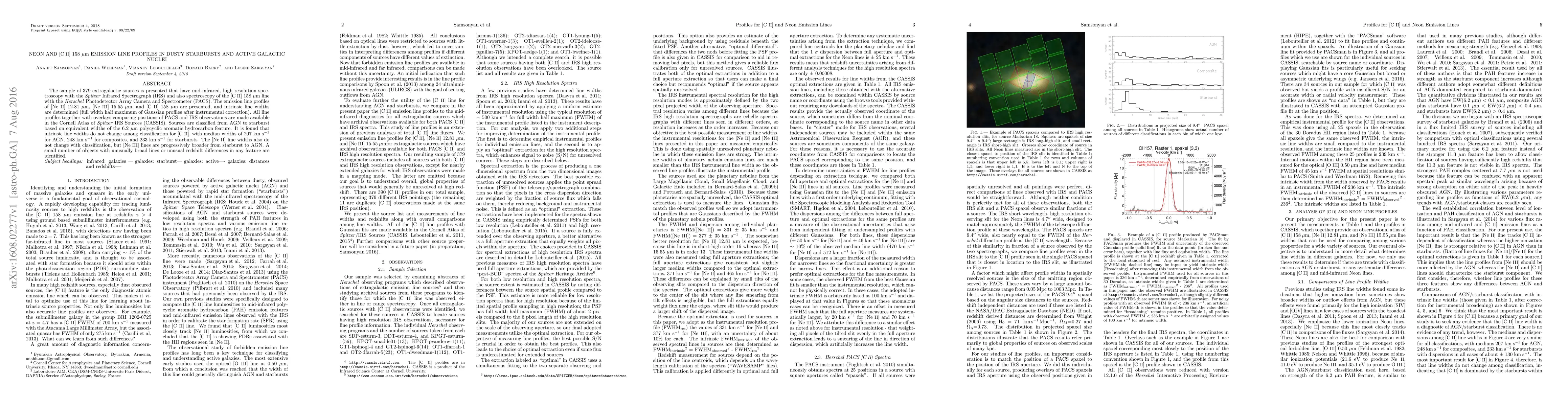 This study analyzes high-resolution spectroscopy of 379 extragalactic sources, focusing on the emission line profiles of [NeII], [NeIII], and [CII]. It finds that intrinsic line widths for [CII] remain consistent across AGN, composite, and starburst classifications, while [NeIII] lines show increasing width from starburst to AGN. A few objects exhibit unusually broad lines or redshift differences.