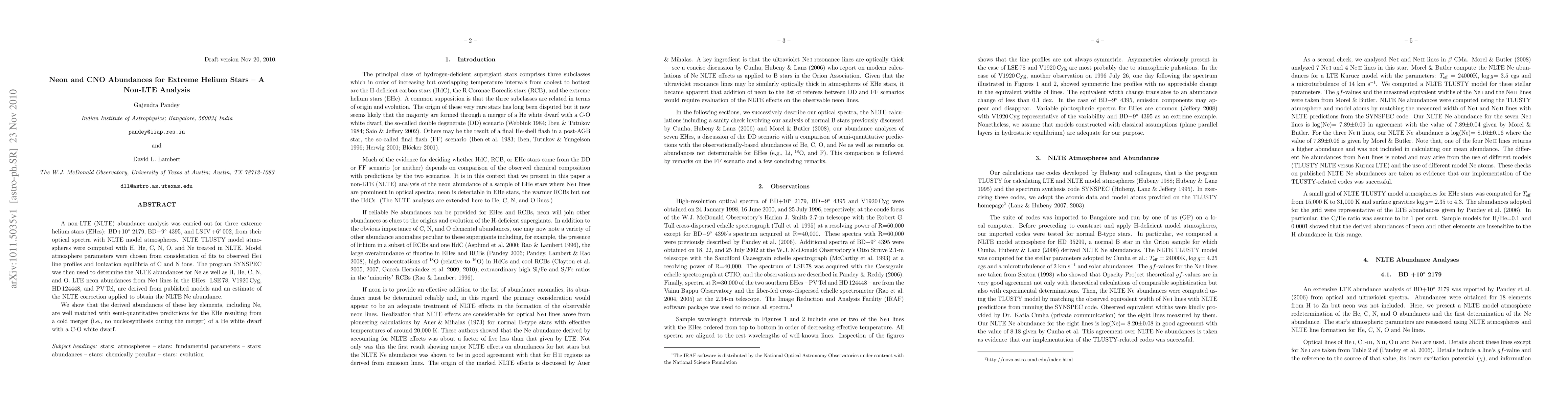 This paper presents a non-LTE abundance analysis of three extreme helium stars, revealing the neon, carbon, nitrogen, and oxygen abundances. The findings support the hypothesis that these stars result from cold mergers between helium and carbon-oxygen white dwarfs without nucleosynthesis.