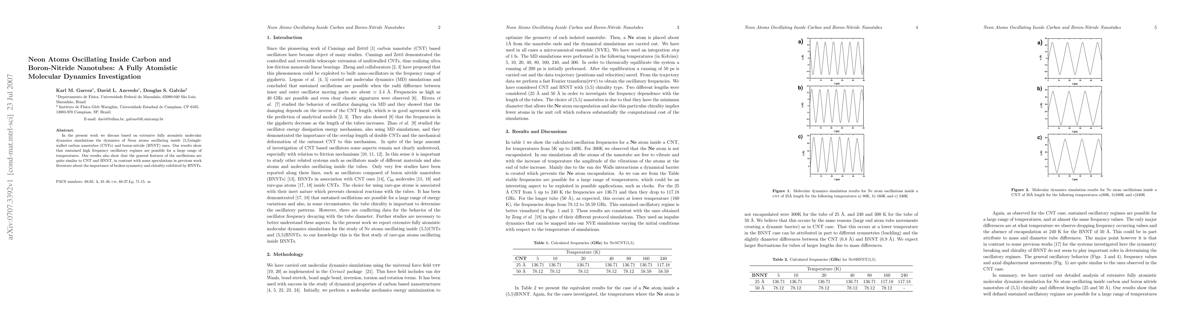 This paper uses fully atomistic molecular dynamics simulations to investigate the oscillatory behavior of Neon atoms inside (5,5) single-walled carbon and boron-nitride nanotubes, revealing sustained high-frequency oscillations over a wide temperature range and showing similar oscillatory characteristics for both nanotube types, contrary to previous claims about BNNTs' unique behavior.