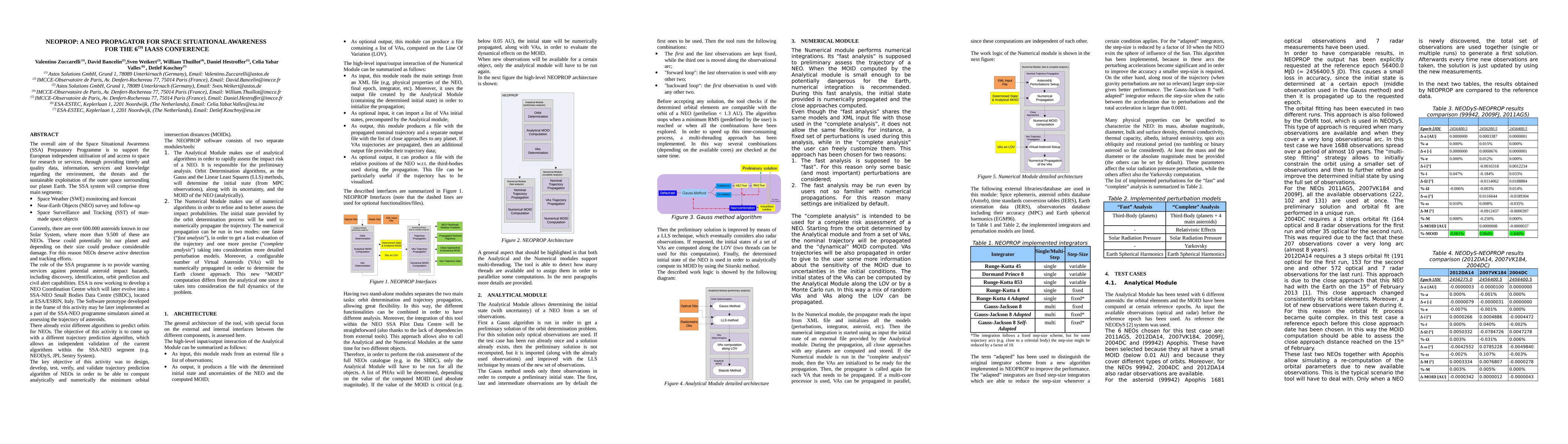 The overall aim of the Space Situational Awareness (SSA) Preparatory Programme is to support the European independent utilisation of and access to space for research or services, through providing timely and quality data, information, services and knowledge regarding the environment, the threats and the sustainable exploitation of the outer space surrounding our planet Earth. The SSA system will comprise three main segments: Space Weather (SWE) monitoring and forecast Near-Earth Objects (NEO) survey and follow-up Space Surveillance and Tracking (SST) of man-made space objects. There already exist different algorithms to predict orbits for NEOs. The objective of this activity is to come up with a different trajectory prediction algorithm, which allows an independent validation of the current algorithms within the SSA-NEO segment (e.g. NEODyS, JPL Sentry System). The key objective of this activity was to design, develop, test, verify, and validate trajectory prediction algorithm of NEOs in order to be able to compute analytically and numerically the minimum orbital intersection distances (MOIDs). The NEOPROP software consists of two separate modules/tools: (i) the Analytical Module makes use of analytical algorithms in order to rapidly assess the impact risk of a NEO. (ii) The Numerical Module makes use of numerical algorithms in order to refine and to better assess the impact probabilities.