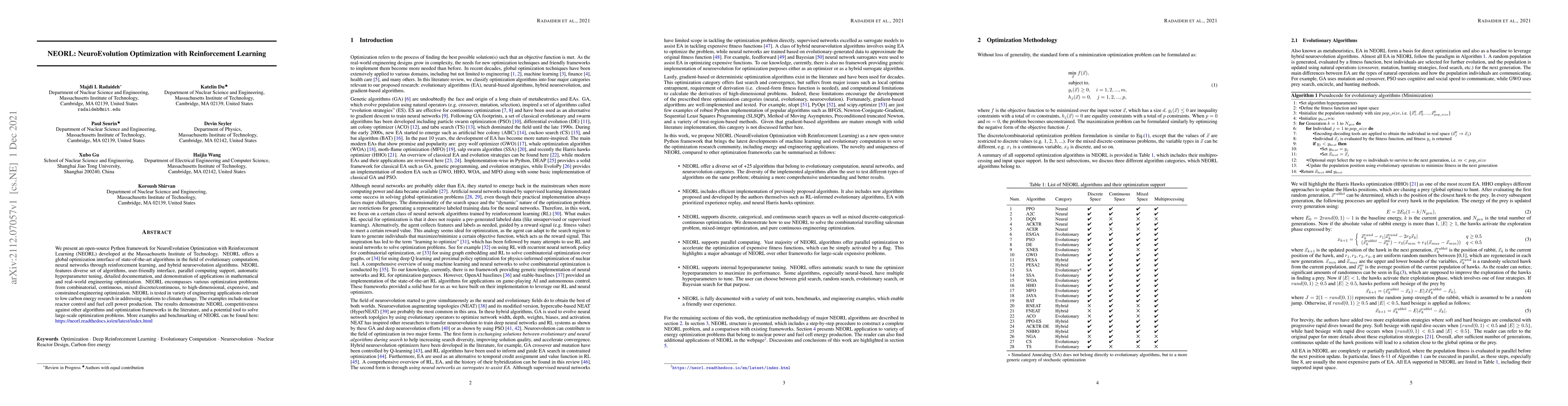 NEORL is an open-source Python framework for NeuroEvolution Optimization with Reinforcement Learning, offering advanced algorithms for diverse optimization problems, and demonstrating competitiveness in engineering applications like nuclear reactor control and fuel cell power production. It provides a user-friendly interface, parallel computing support, and automatic hyperparameter tuning.