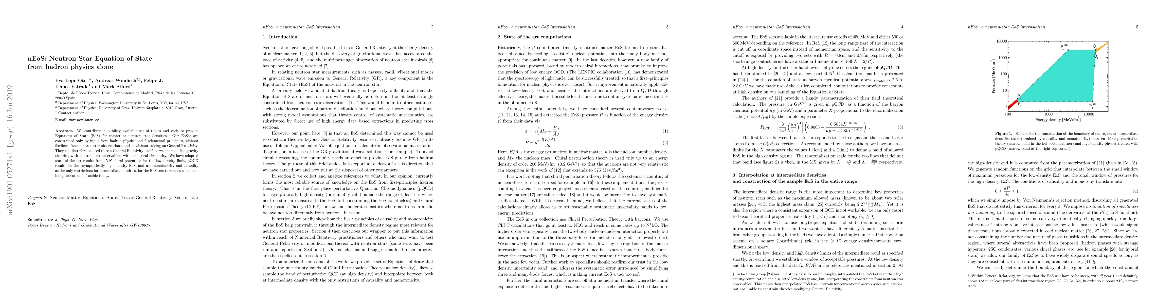We contribute a publicly available set of tables and code to provide Equations of State (EoS) for matter at neutron star densities. Our EoSes are constrained only by input from hadron physics and fundamental principles, without feedback from neutron star observations, and so without relying on General Relativity. They can therefore be used to test General Relativity itself, as well as modified gravity theories, with neutron star observables, without logical circularity. We have adapted state of the art results from NN chiral potentials for the low--density limit, pQCD results for the asymptotically high-density EoS, and use monotonicity and causality as the only restrictions for intermediate densities, for the EoS sets to remain as model-independent as is feasible today.