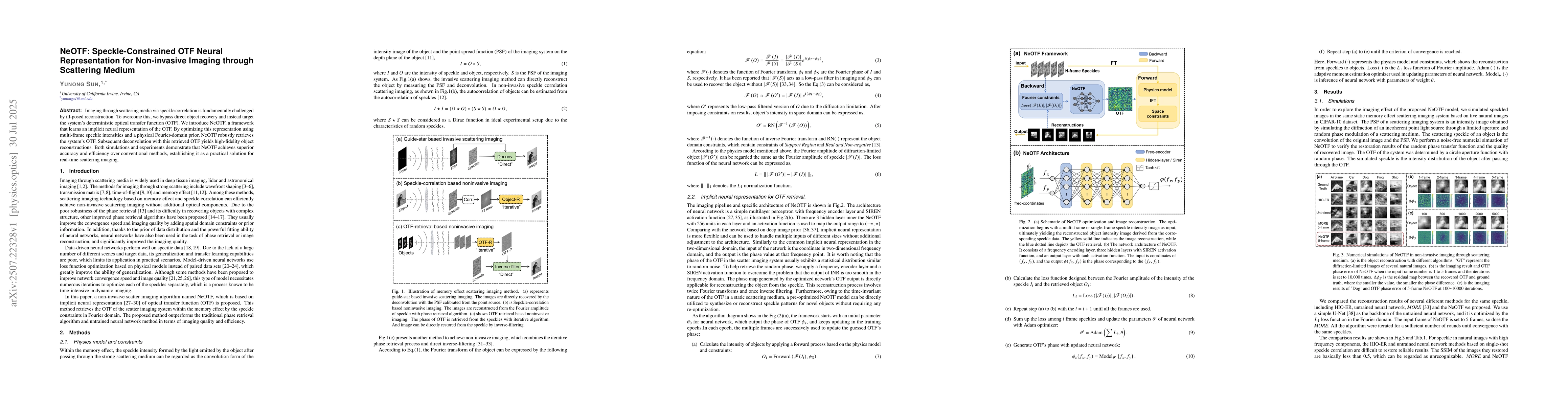 The research introduces NeOTF, a framework that learns an implicit neural representation of the optical transfer function (OTF) for imaging through scattering media. It optimizes this representation using multi-frame speckle intensities and a physical Fourier-domain prior, bypassing direct object recovery.