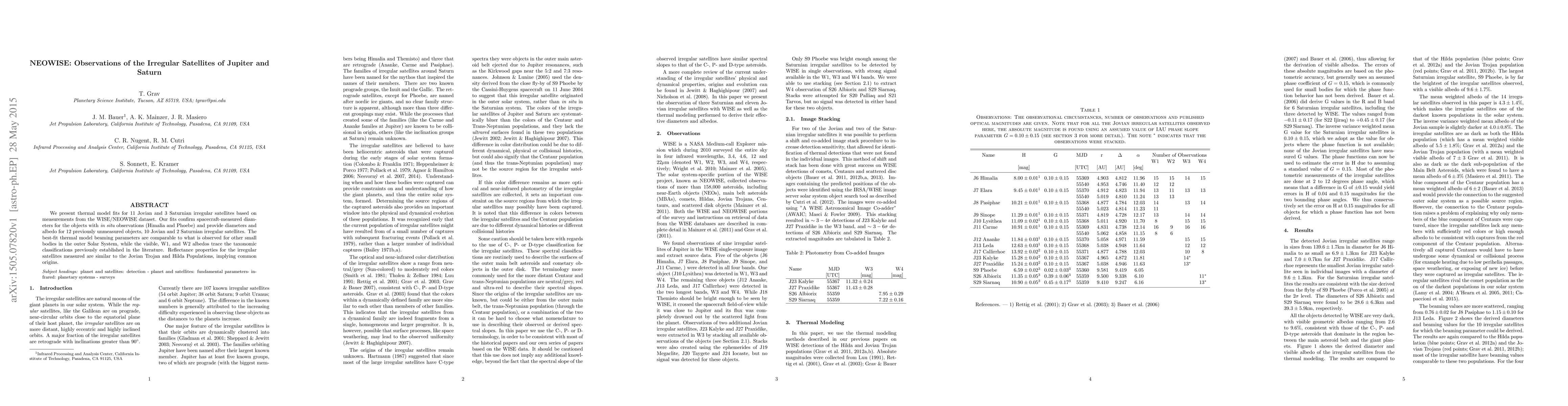 We present thermal model fits for 11 Jovian and 3 Saturnian irregular satellites based on measurements from the WISE/NEOWISE dataset. Our fits confirm spacecraft-measured diameters for the objects with in situ observations (Himalia and Phoebe) and provide diameters and albedo for 12 previously unmeasured objects, 10 Jovian and 2 Saturnian irregular satellites. The best-fit thermal model beaming parameters are comparable to what is observed for other small bodies in the outer Solar System, while the visible, W1, and W2 albedos trace the taxonomic classifications previously established in the literature. Reflectance properties for the irregular satellites measured are similar to the Jovian Trojan and Hilda Populations, implying common origins.