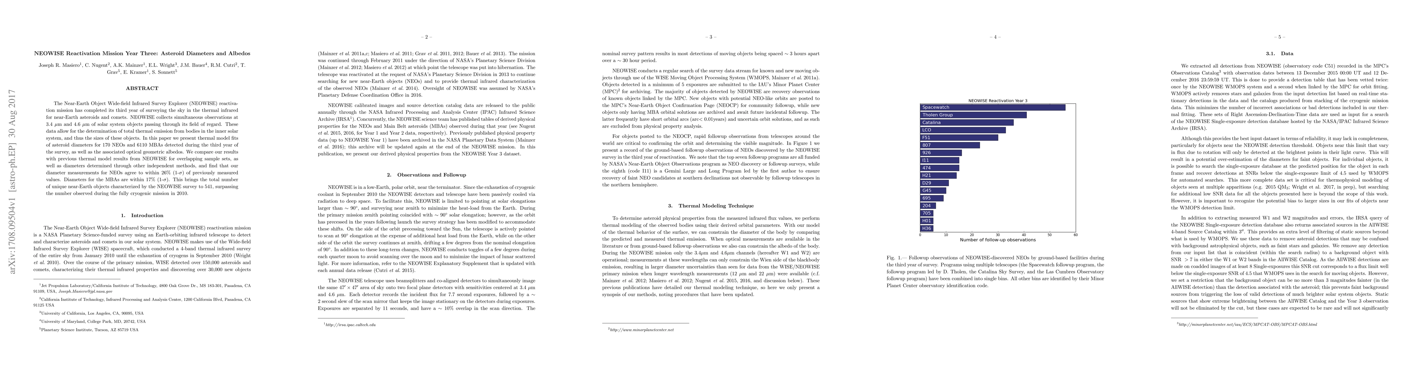 The NEOWISE reactivation mission's third year survey identified diameters and albedos for 170 near-Earth objects (NEOs) and 6110 main-belt asteroids (MBAs), showing agreement with previous measurements within 26% for NEOs and 17% for MBAs. This expands the total number of characterized objects to 541.