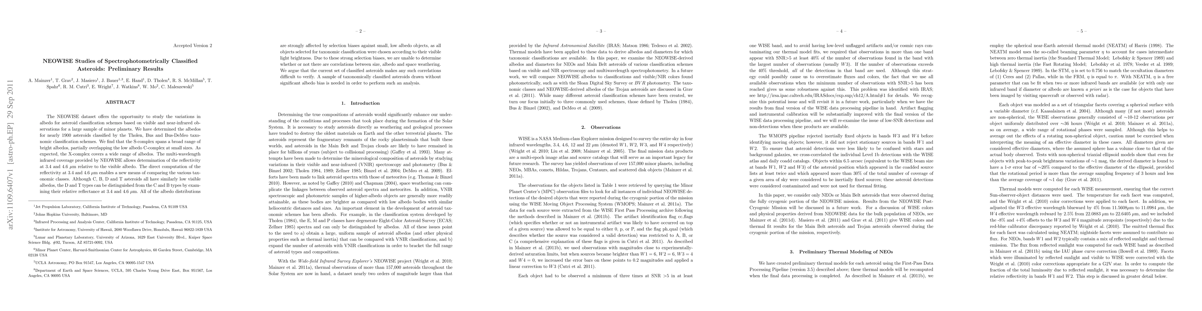 The NEOWISE dataset enables the study of albedo variations for asteroid classification schemes, revealing that S-complex asteroids have a broad range of bright albedos, overlapping with low albedo C-complex at small sizes. The multi-wavelength infrared coverage allows distinguishing D and T types from C and B types by their reflectance at 3.4 and 4.6 µm, despite similar visible albedos.