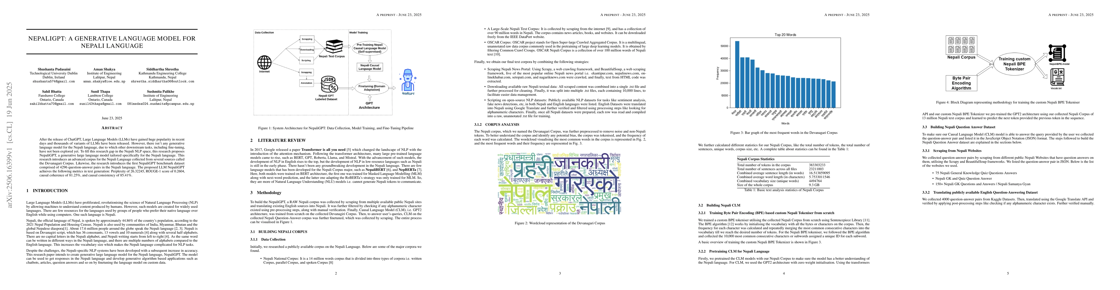 After the release of ChatGPT, Large Language Models (LLMs) have gained huge popularity in recent days and thousands of variants of LLMs have been released. However, there is no generative language model for the Nepali language, due to which other downstream tasks, including fine-tuning, have not been explored yet. To fill this research gap in the Nepali NLP space, this research proposes \textit{NepaliGPT}, a generative large language model tailored specifically for the Nepali language. This research introduces an advanced corpus for the Nepali language collected from several sources, called the Devanagari Corpus. Likewise, the research introduces the first NepaliGPT benchmark dataset comprised of 4,296 question-answer pairs in the Nepali language. The proposed LLM NepaliGPT achieves the following metrics in text generation: Perplexity of 26.32245, ROUGE-1 score of 0.2604, causal coherence of 81.25\%, and causal consistency of 85.41\%.