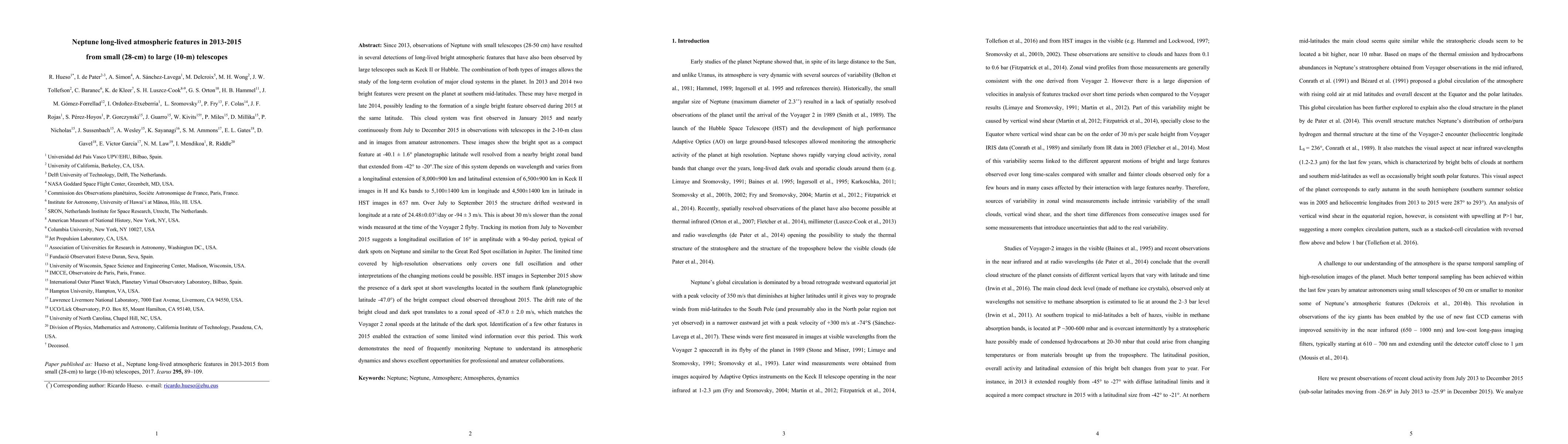 Since 2013, observations of Neptune with small telescopes have resulted in several detections of long-lived bright atmospheric features that have also been observed by large telescopes such as Keck II or Hubble. The combination of both types of images allows the study of the long term evolution of major cloud systems in the planet. In 2013 and 2014 two bright features were present on the planet at southern mid latitudes. These may have merged in late 2014, possibly leading to the formation of a single bright feature observed during 2015 at the same latitude. This cloud system was first observed in January 2015 and nearly continuously from July to December 2015 in observations with telescopes in the 2 to 10 meter class and in images from amateur astronomers. These images show the bright spot as a compact feature at 40.1 deg South planetographic latitude well resolved from a nearby bright zonal band that extended from 42 deg South to 20 deg South. Tracking its motion from July to November 2015 suggests a longitudinal oscillation of 16 deg in amplitude with a 90 day period, typical of dark spots on Neptune and similar to the Great Red Spot oscillation in Jupiter. The limited time covered by high-resolution observations only covers one full oscillation and other interpretations of the changing motions could be possible. HST images in September 2015 show the presence of a dark spot at short wavelengths in the southern flank of the bright cloud observed throughout 2015.