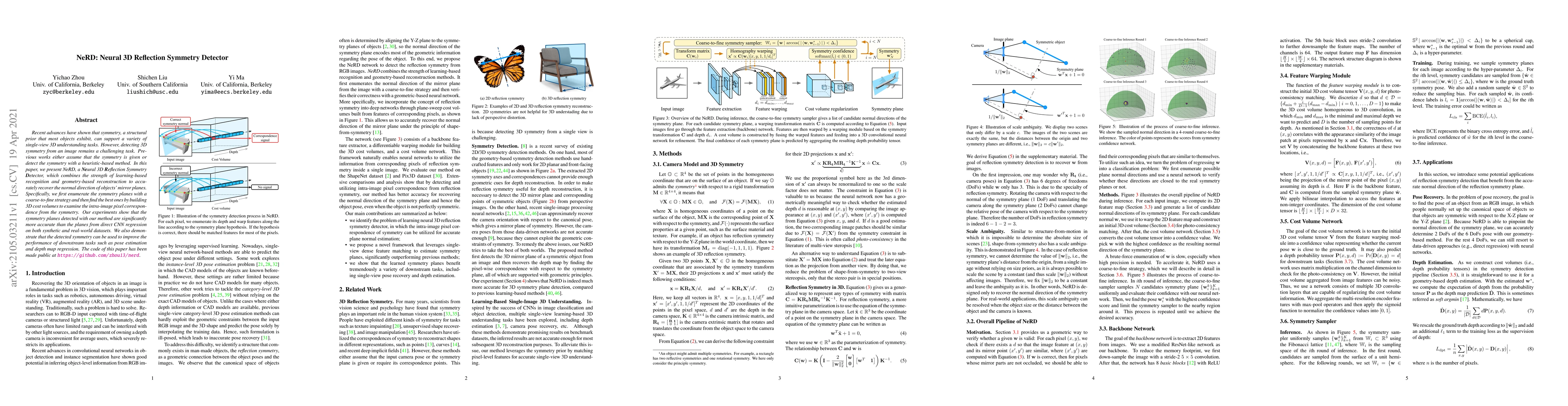NeRD introduces a neural network to detect 3D reflection symmetry in single images by combining learning-based recognition and geometry-based reconstruction, significantly outperforming heuristic methods and direct CNN regression in accuracy. The detected symmetry improves downstream tasks like pose estimation and depth map regression.