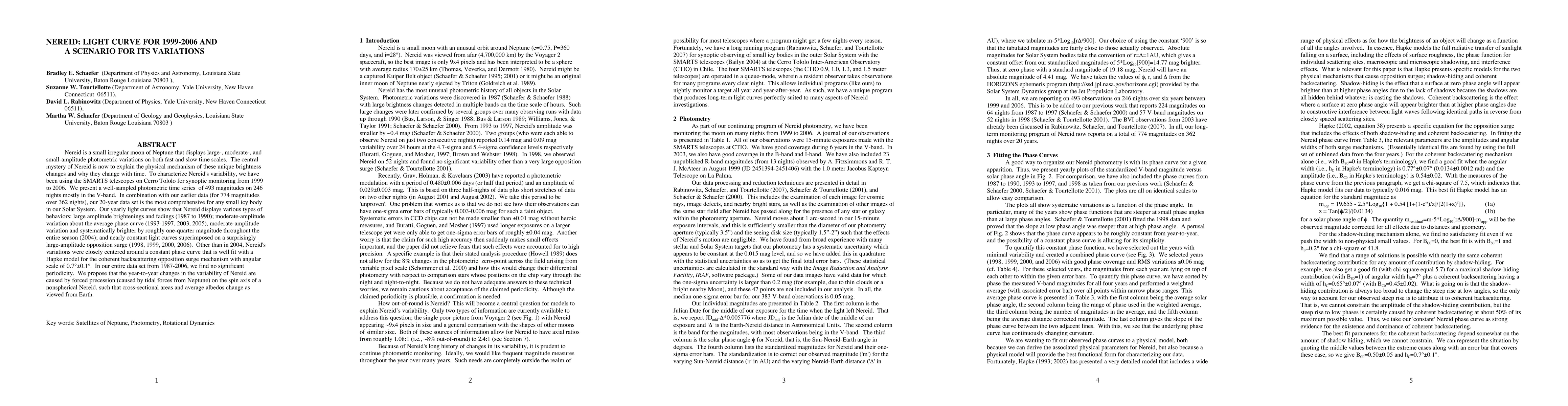 Nereid is a small irregular moon of Neptune that displays large-, moderate-, and small-amplitude photometric variations on both fast and slow time scales. The central mystery of Nereid is now to explain the physical mechanism of these unique brightness changes and why they change with time. To characterize Nereid's variability, we have been using the SMARTS telescopes on Cerro Tololo for synoptic monitoring from 1999 to 2006. We present a well-sampled photometric time series of 493 magnitudes on 246 nights mostly in the V-band. In combination with our earlier data (for 774 magnitudes over 362 nights), our 20-year data set is the most comprehensive for any small icy body in our Solar System. Our yearly light curves show that Nereid displays various types of behaviors: large amplitude brightenings and fadings (1987 to 1990); moderate-amplitude variation about the average phase curve (1993-1997, 2003, 2005), moderate-amplitude variation and systematically brighter by roughly one-quarter magnitude throughout the entire season (2004); and nearly constant light curves superimposed on a surprisingly large-amplitude opposition surge (1998, 1999, 2000, 2006). Other than in 2004, Nereid's variations were closely centered around a constant phase curve that is well fit with a Hapke model for the coherent backscattering opposition surge mechanism with angular scale of 0.7+-0.1 degrees. In our entire data set from 1987-2006, we find no significant periodicity. We propose that the year-to-year changes in the variability of Nereid are caused by forced precession (caused by tidal forces from Neptune) on the spin axis of a nonspherical Nereid, such that cross-sectional areas and average albedos change as viewed from Earth.