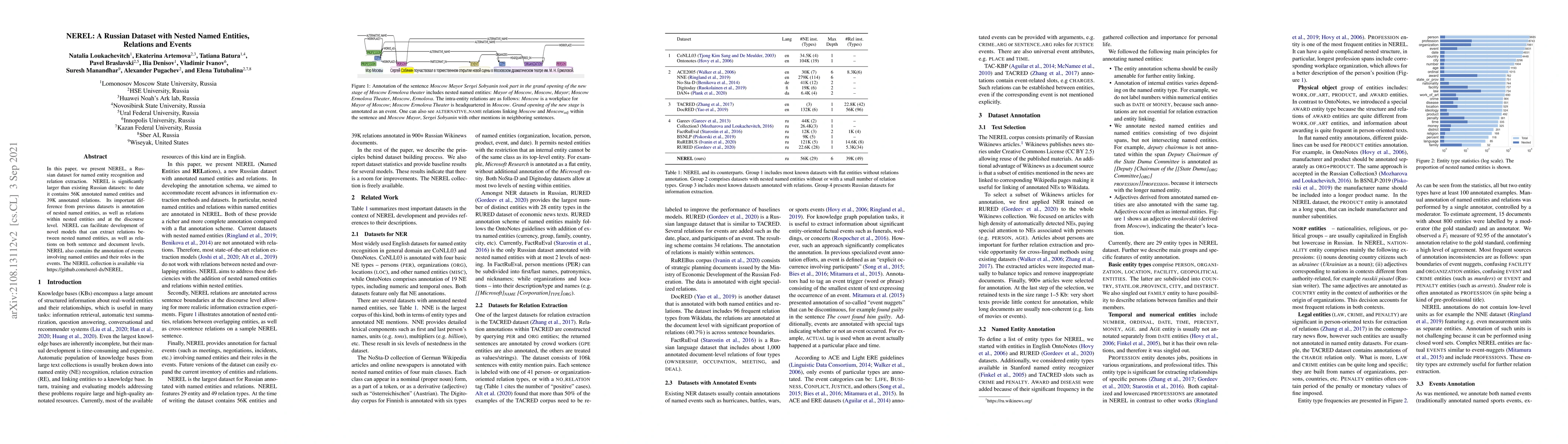 NEREL is a large Russian dataset for named entity recognition and relation extraction, featuring 56K annotated named entities and 39K annotated relations, with unique annotations of nested entities and discourse-level relations. It also includes event annotations and is available for research via GitHub.