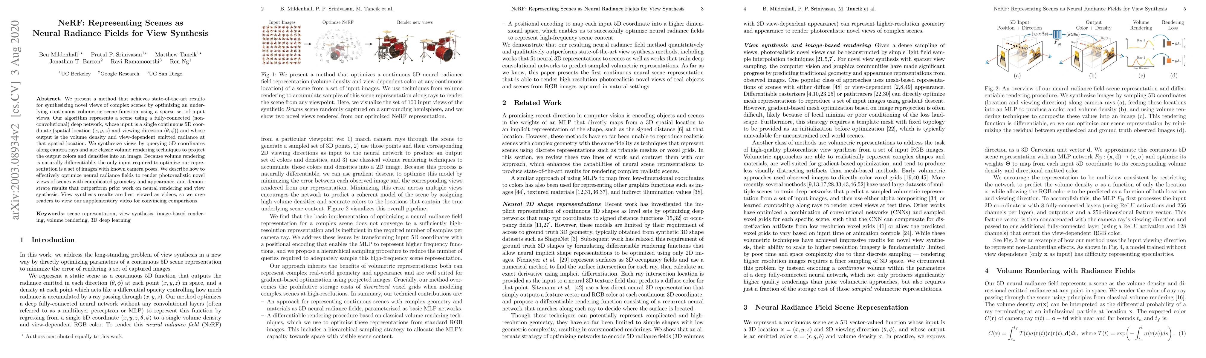 We present a method that achieves state-of-the-art results for synthesizing novel views of complex scenes by optimizing an underlying continuous volumetric scene function using a sparse set of input views. Our algorithm represents a scene using a fully-connected (non-convolutional) deep network, whose input is a single continuous 5D coordinate (spatial location $(x,y,z)$ and viewing direction $(\theta, \phi)$) and whose output is the volume density and view-dependent emitted radiance at that spatial location. We synthesize views by querying 5D coordinates along camera rays and use classic volume rendering techniques to project the output colors and densities into an image. Because volume rendering is naturally differentiable, the only input required to optimize our representation is a set of images with known camera poses. We describe how to effectively optimize neural radiance fields to render photorealistic novel views of scenes with complicated geometry and appearance, and demonstrate results that outperform prior work on neural rendering and view synthesis. View synthesis results are best viewed as videos, so we urge readers to view our supplementary video for convincing comparisons.