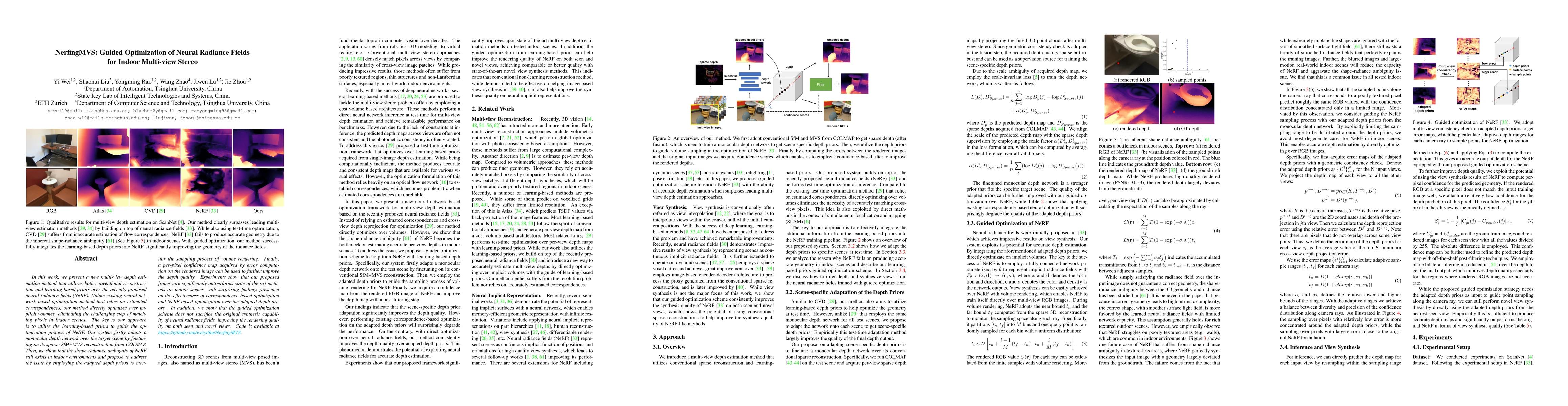 This paper introduces NerfingMVS, a method for optimizing neural radiance fields (NeRF) for indoor multi-view stereo by directly optimizing implicit volumes instead of relying on pixel correspondences. The approach uses learning-based priors from a finetuned monocular depth network to guide the NeRF optimization, addressing the shape-radiance ambiguity and improving depth quality, while maintaining NeRF's rendering capabilities.