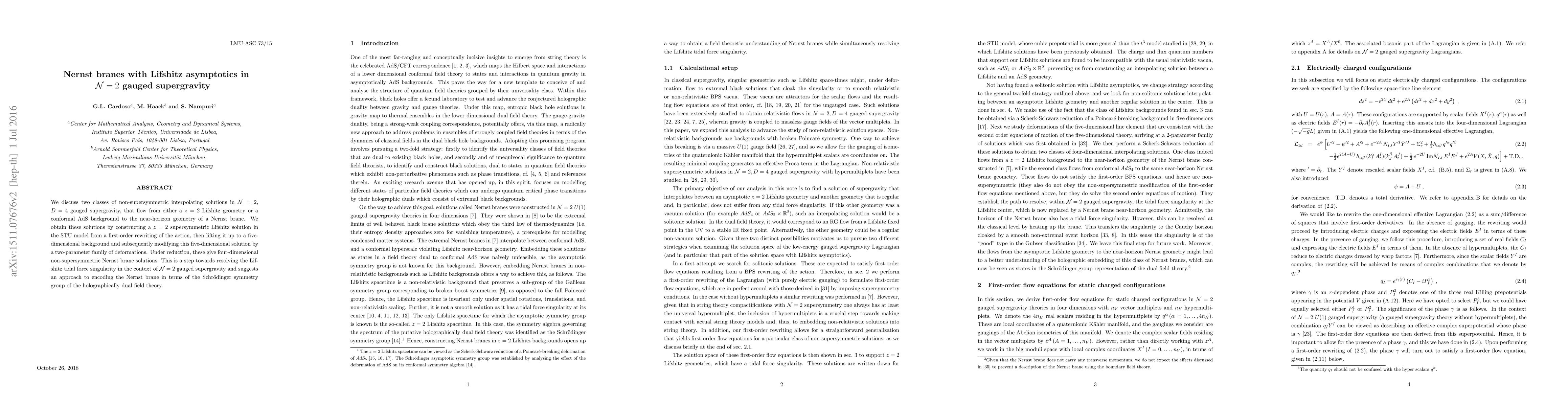 This paper explores non-supersymmetric solutions in N=2, D=4 gauged supergravity that transition from Lifshitz or conformal AdS backgrounds to Nernst brane geometries. The authors achieve this by constructing a z=2 supersymmetric Lifshitz solution in the STU model and modifying it to obtain four-dimensional Nernst brane solutions, contributing to resolving the Lifshitz tidal force singularity.