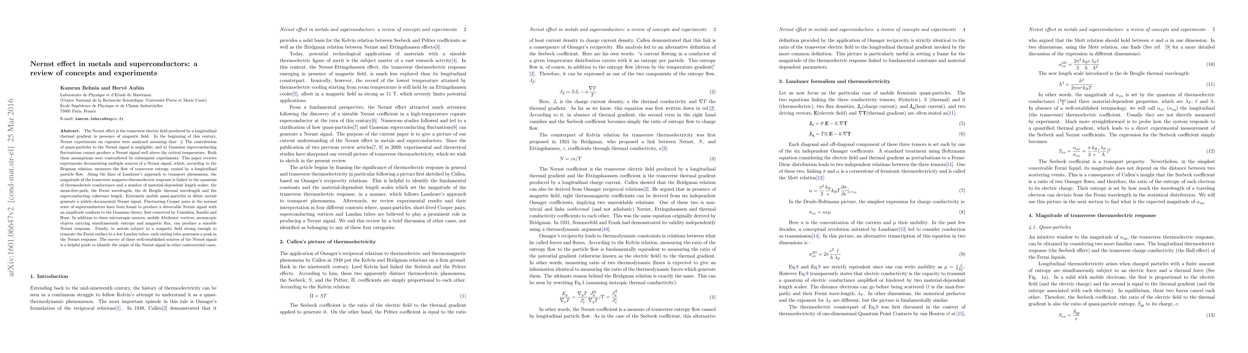 This paper reviews the Nernst effect, detailing various sources of the transverse electric field produced by thermal gradients in magnetic fields, including quasi-particles, Cooper pairs, Abrikosov vortices, and Landau tubes. It highlights the significance of material-dependent length scales in determining the effect's magnitude.