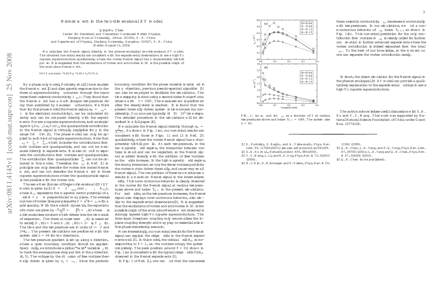 We calculate the Nernst signal directly in the phenomenological two-dimensional XY model. The obtained numerical results are consistent with the experimental observations in some high-Tc cuprate superconductors qualitatively, where the vortex Nernst signal has a characteristic tilt-hill profile. It is suggested that the excitations of vortex and anti-vortex in 2D is the possible origin of the anomalous Nernst effect.