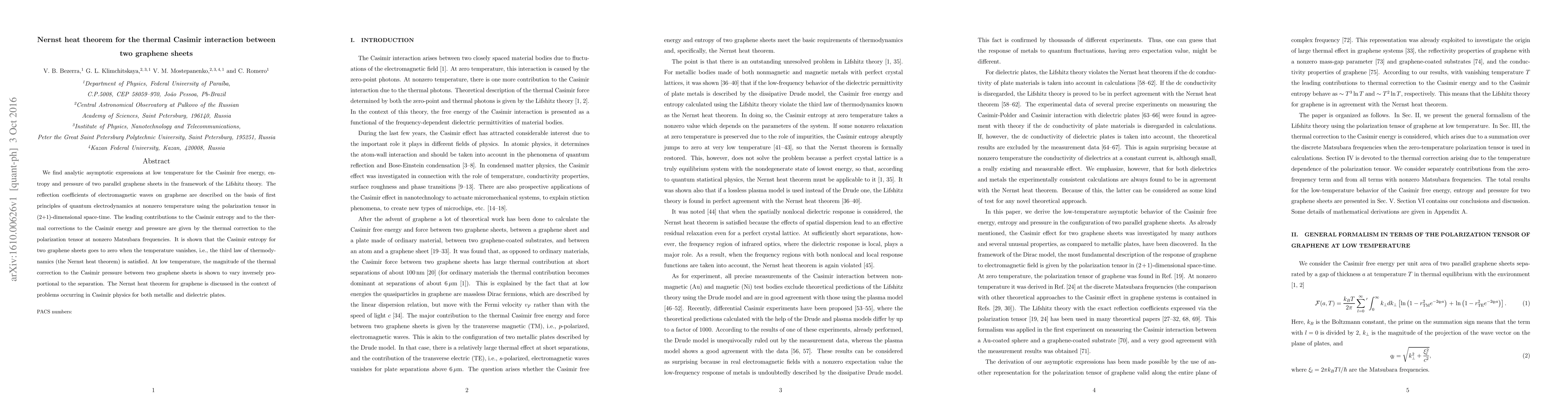 This paper derives analytic expressions for the Casimir free energy, entropy, and pressure between two parallel graphene sheets at low temperatures, confirming the Nernst heat theorem. It demonstrates that the Casimir entropy diminishes to zero as temperature approaches zero, and finds that the thermal correction to the Casimir pressure varies inversely with separation.
