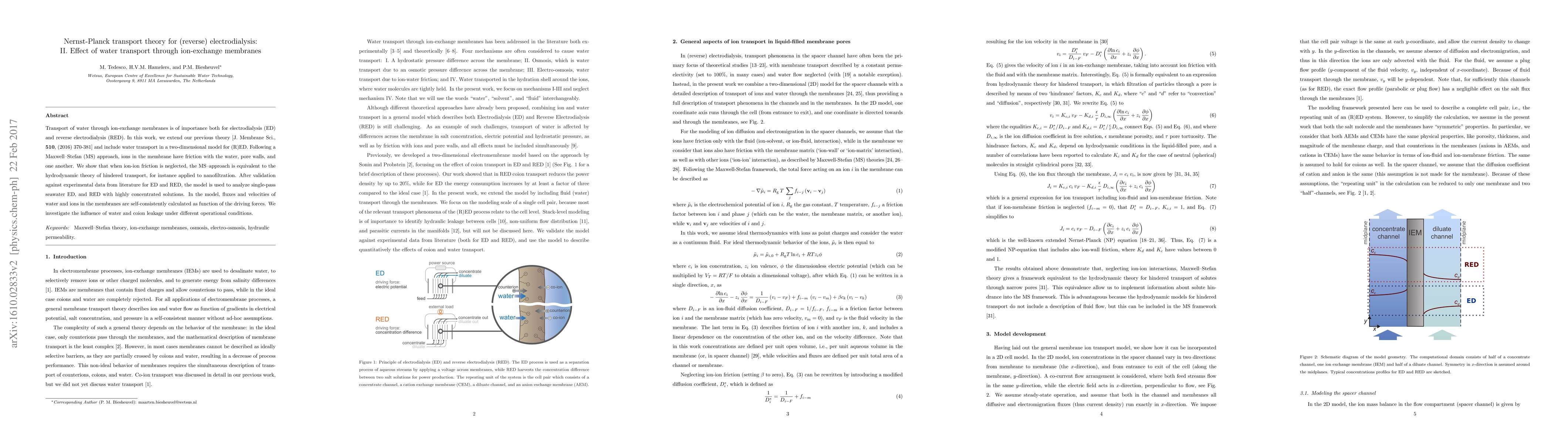 This paper extends a previous Nernst-Planck transport theory to include water transport in ion-exchange membranes for electrodialysis and reverse electrodialysis. The Maxwell-Stefan approach is used to model the friction between ions, water, and pore walls, and the theory is validated against experimental data.