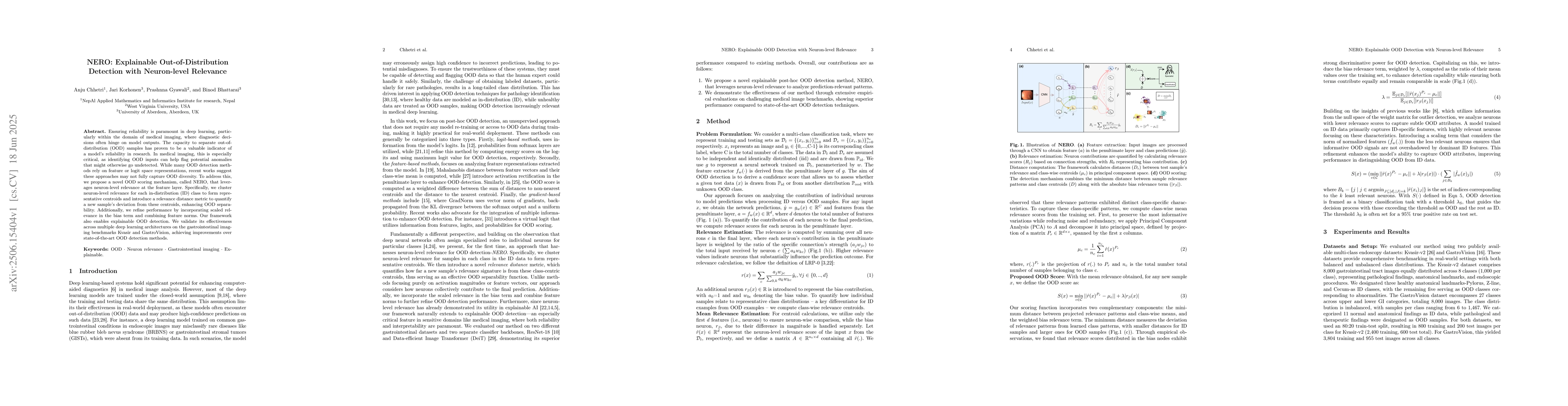 Ensuring reliability is paramount in deep learning, particularly within the domain of medical imaging, where diagnostic decisions often hinge on model outputs. The capacity to separate out-of-distribution (OOD) samples has proven to be a valuable indicator of a model's reliability in research. In medical imaging, this is especially critical, as identifying OOD inputs can help flag potential anomalies that might otherwise go undetected. While many OOD detection methods rely on feature or logit space representations, recent works suggest these approaches may not fully capture OOD diversity. To address this, we propose a novel OOD scoring mechanism, called NERO, that leverages neuron-level relevance at the feature layer. Specifically, we cluster neuron-level relevance for each in-distribution (ID) class to form representative centroids and introduce a relevance distance metric to quantify a new sample's deviation from these centroids, enhancing OOD separability. Additionally, we refine performance by incorporating scaled relevance in the bias term and combining feature norms. Our framework also enables explainable OOD detection. We validate its effectiveness across multiple deep learning architectures on the gastrointestinal imaging benchmarks Kvasir and GastroVision, achieving improvements over state-of-the-art OOD detection methods.