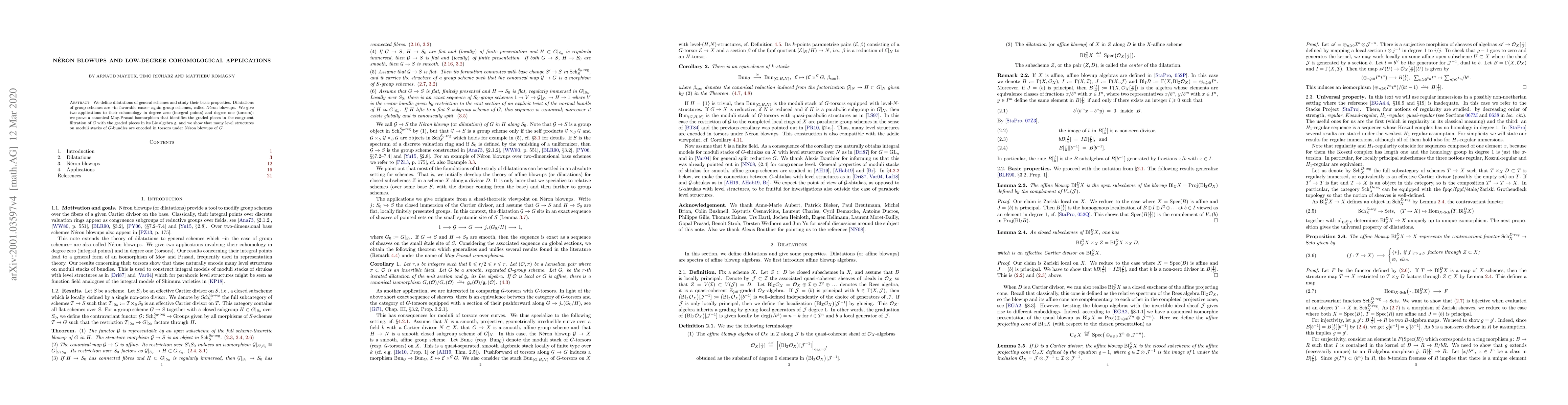 We define dilatations of general schemes and study their basic properties. Dilatations of group schemes are -- in favorable cases -- again group schemes, called N\'eron blowups. We give two applications to their cohomology in degree zero (integral points) and degree one (torsors): we prove a canonical Moy-Prasad isomorphism that identifies the graded pieces in the congruent filtration of $G$ with the graded pieces in its Lie algebra $\mathfrak g$, and we show that many level structures on moduli stacks of $G$-bundles are encoded in torsors under N\'eron blowups of $G$.