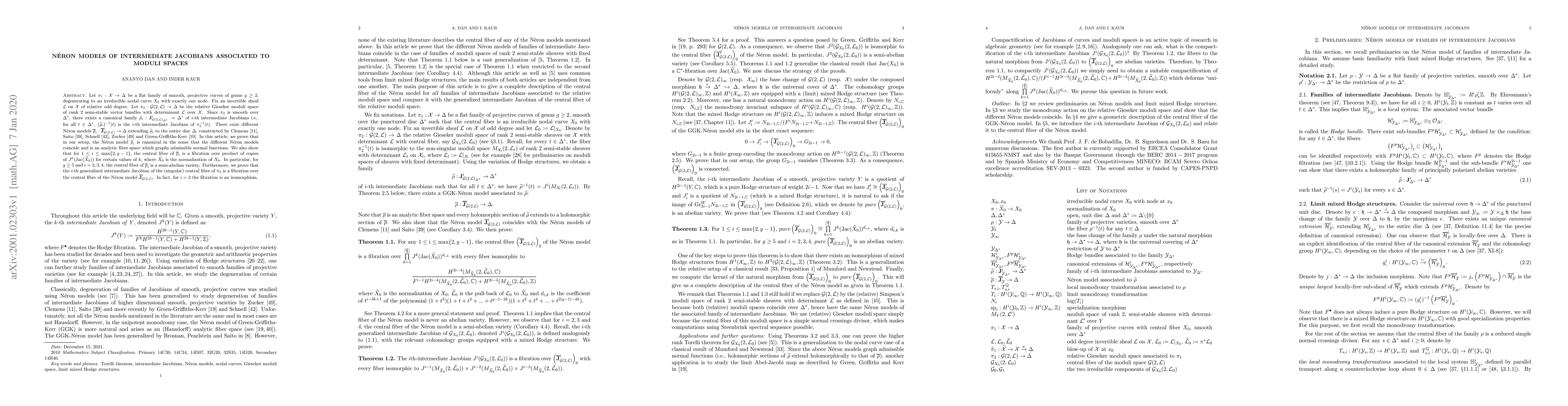 Let $\pi_1:\mathcal{X} \to \Delta$ be a flat family of smooth, projective curves of genus $g \ge 2$, degenerating to an irreducible nodal curve $X_0$ with exactly one node. Fix an invertible sheaf $\mathcal{L}$ on $\mathcal{X}$ of relative odd degree. Let $\pi_2:\mathcal{G}(2,\mathcal{L}) \to \Delta$ be the relative Gieseker moduli space of rank $2$ semi-stable vector bundles with determinant $\mathcal{L}$ over $\mathcal{X}$. Since $\pi_2$ is smooth over $\Delta^*$, there exists a canonical family $\widetilde{\rho}_i:\mathbf{J}^i_{\mathcal{G}(2, \mathcal{L})_{\Delta^*}} \to \Delta^{*}$ of $i$-th intermediate Jacobians i.e., for all $t \in \Delta^*$, $(\widetilde{\rho}_i)^{-1}(t)$ is the $i$-th intermediate Jacobian of $\pi_2^{-1}(t)$. There exist different N\'{e}ron models $\overline{\rho}_i:\overline{\mathbf{J}}_{\mathcal{G}(2, \mathcal{L})}^i \to \Delta$ extending $\widetilde{\rho}_i$ to the entire disc $\Delta$, constructed by Clemens, Saito, Schnell, Zucker and Green-Griffiths-Kerr. In this article, we prove that in our setup, the N\'{e}ron model $\overline{\rho}_i$ is canonical in the sense that the different N\'{e}ron models coincide and is an analytic fiber space which graphs admissible normal functions. We also show that for $1 \le i \le \max\{2,g-1\}$, the central fiber of $\overline{\rho}_i$ is a fibration over product of copies of $J^k(\mathrm{Jac}(\widetilde{X}_0))$ for certain values of $k$, where $\widetilde{X}_0$ is the normalization of $X_0$. In particular, for $g \ge 5$ and $i=2, 3, 4$, the central fiber of $\overline{\rho}_i$ is a semi-abelian variety. Furthermore, we prove that the $i$-th generalized intermediate Jacobian of the (singular) central fibre of $\pi_2$ is a fibration over the central fibre of the N\'{e}ron model $\overline{\mathbf{J}}^i_{\mathcal{G}(2, \mathcal{L})}$. In fact, for $i=2$ the fibration is an isomorphism.