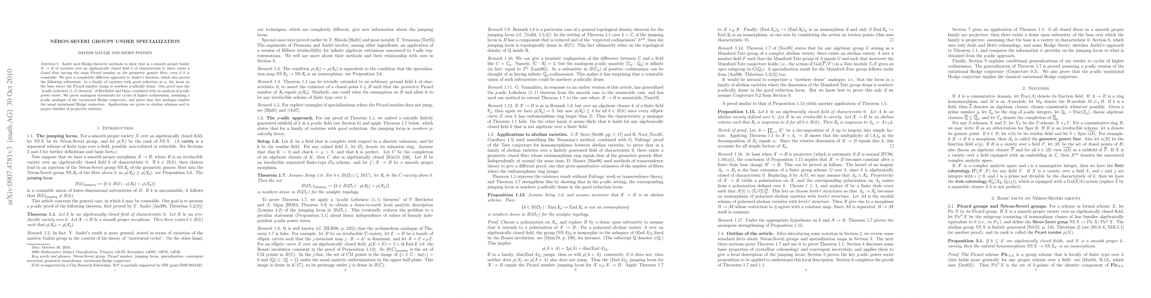 Andr\'e used Hodge-theoretic methods to show that in a smooth proper family X to B of varieties over an algebraically closed field k of characteristic 0, there exists a closed fiber having the same Picard number as the geometric generic fiber, even if k is countable. We give a completely different approach to Andr\'e's theorem, which also proves the following refinement: in a family of varieties with good reduction at p, the locus on the base where the Picard number jumps is nowhere p-adically dense. Our proof uses the ``p-adic Lefschetz (1,1) theorem'' of Berthelot and Ogus, combined with an analysis of p-adic power series. We prove analogous statements for cycles of higher codimension, assuming a p-adic analogue of the variational Hodge conjecture, and prove that this analogue implies the usual variational Hodge conjecture. Applications are given to abelian schemes and to proper families of projective varieties.