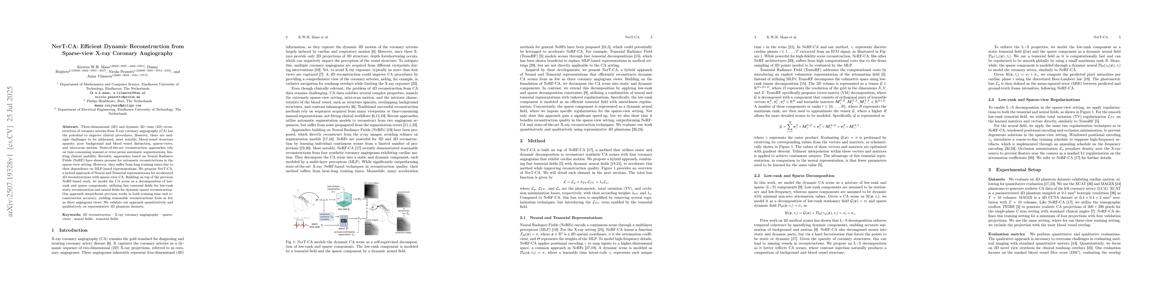 Three-dimensional (3D) and dynamic 3D+time (4D) reconstruction of coronary arteries from X-ray coronary angiography (CA) has the potential to improve clinical procedures. However, there are multiple challenges to be addressed, most notably, blood-vessel structure sparsity, poor background and blood vessel distinction, sparse-views, and intra-scan motion. State-of-the-art reconstruction approaches rely on time-consuming manual or error-prone automatic segmentations, limiting clinical usability. Recently, approaches based on Neural Radiance Fields (NeRF) have shown promise for automatic reconstructions in the sparse-view setting. However, they suffer from long training times due to their dependence on MLP-based representations. We propose NerT-CA, a hybrid approach of Neural and Tensorial representations for accelerated 4D reconstructions with sparse-view CA. Building on top of the previous NeRF-based work, we model the CA scene as a decomposition of low-rank and sparse components, utilizing fast tensorial fields for low-rank static reconstruction and neural fields for dynamic sparse reconstruction. Our approach outperforms previous works in both training time and reconstruction accuracy, yielding reasonable reconstructions from as few as three angiogram views. We validate our approach quantitatively and qualitatively on representative 4D phantom datasets.