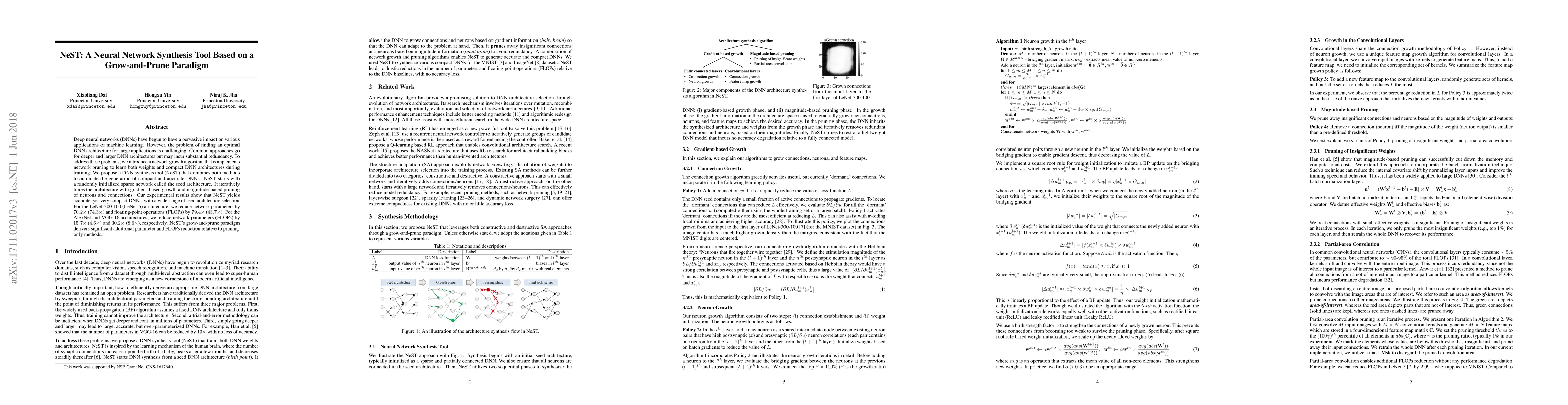 NeST is a neural network synthesis tool that employs a grow-and-prune paradigm to automatically generate compact and accurate deep neural networks (DNNs). It achieves significant reductions in network parameters and floating-point operations compared to traditional methods, demonstrating up to 70.2x parameter reduction for LeNet-300-100.
