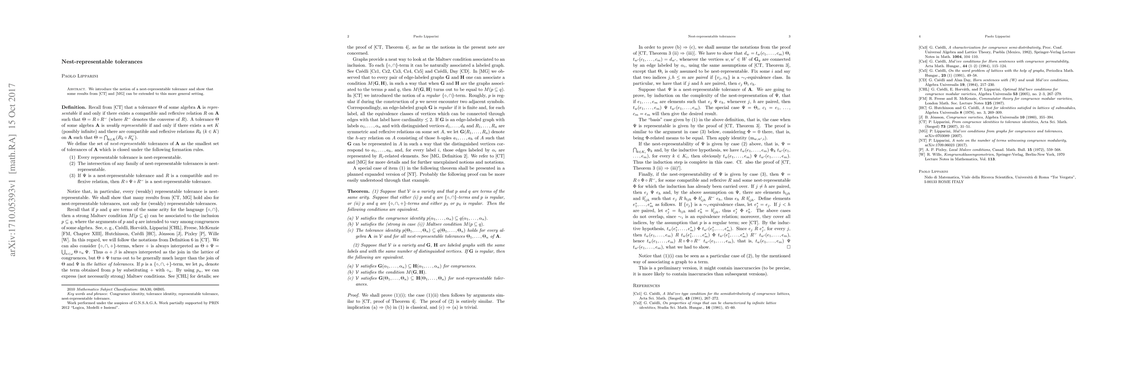 We introduce the notion of a nest-representable tolerance and show that some results from our former paper "From congruence identities to tolerance identities" [CT] can be extended to this more general setting.