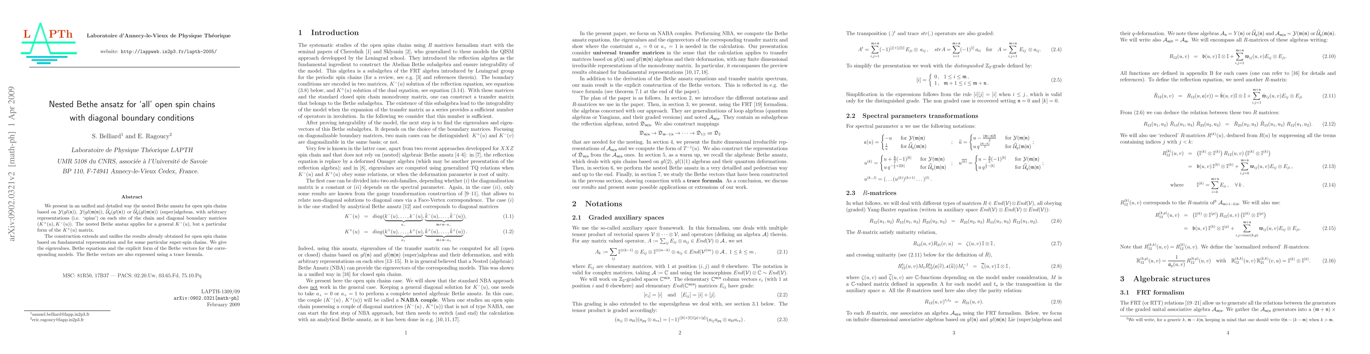 We present in an unified and detailed way the nested Bethe ansatz for open spin chains based on Y(gl(\fn)), Y(gl(\fm|\fn)), U_{q}(gl(\fn)) or U_{q}(gl(\fm|\fn)) (super)algebras, with arbitrary representations (i.e. `spins') on each site of the chain and diagonal boundary matrices (K^+(u),K^-(u)). The nested Bethe anstaz applies for a general K^-(u), but a particular form of the K^+(u) matrix. The construction extends and unifies the results already obtained for open spin chains based on fundamental representation and for some particular super-spin chains. We give the eigenvalues, Bethe equations and the form of the Bethe vectors for the corresponding models. The Bethe vectors are expressed using a trace formula.