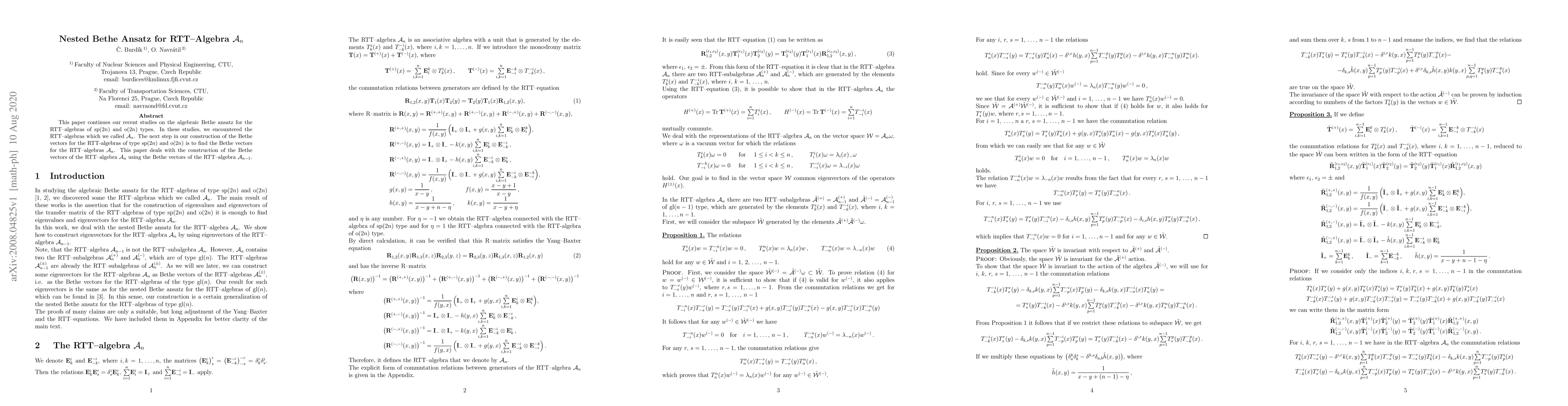 This paper continues our recent studies on the algebraic Bethe ansatz for the RTT-algebras of sp($2n$) and o($2n$) types. In these studies, we encountered the RTT-algebras which we called An. The next step in our construction of the Bethe vectors for the RTT-algebras of type sp($2n$) and o($2n$) is to find the Bethe vectors for the RTT-algebras $\mathcal{A}_n$. This paper deals with the construction of the Bethe vectors of the RTT-algebra An using the Bethe vectors of the RTT-algebra $\mathcal{A}_{n-1}$.
