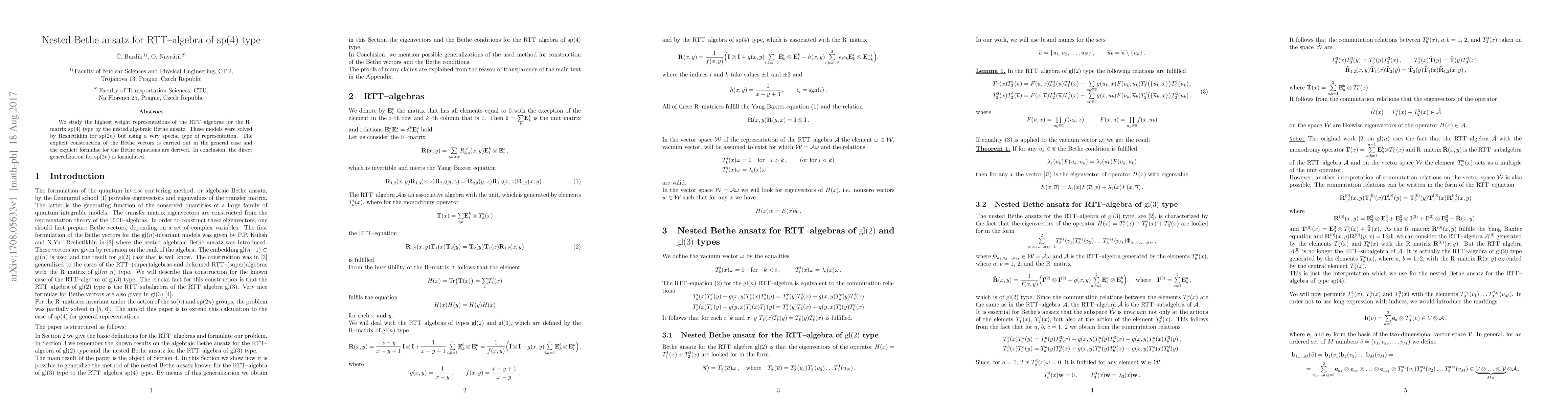 We study the highest weight representations of the RTT--algebras for the R--matrix sp(4) type by the nested algebraic Bethe ansatz. These models were solved by Reshetikhin for sp(2n) but using a very special type of representation. The explicit construction of the Bethe vectors is carried out in the general case and the explicit formulae for the Bethe equations are derived. In conclusion, the direct generalization for sp(2n) is formulated.