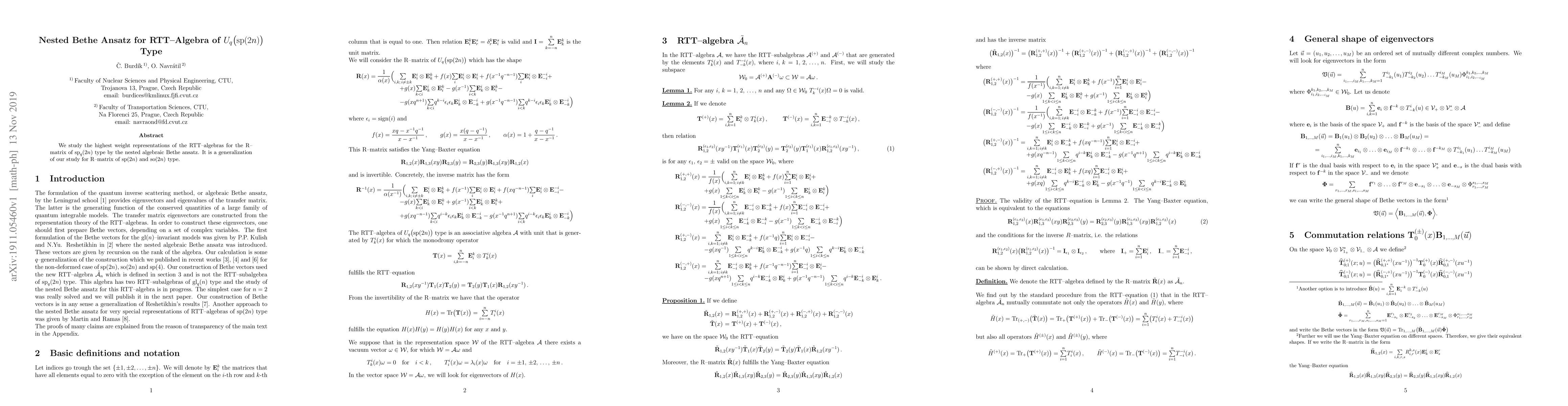 Summary: This paper explores the highest weight representations of RTT algebras for the sp_q(2n) R-matrix using the nested algebraic Bethe ansatz, extending previous studies on sp(2n) and so(2n) types. The methodology provides a generalized framework for these algebraic structures.