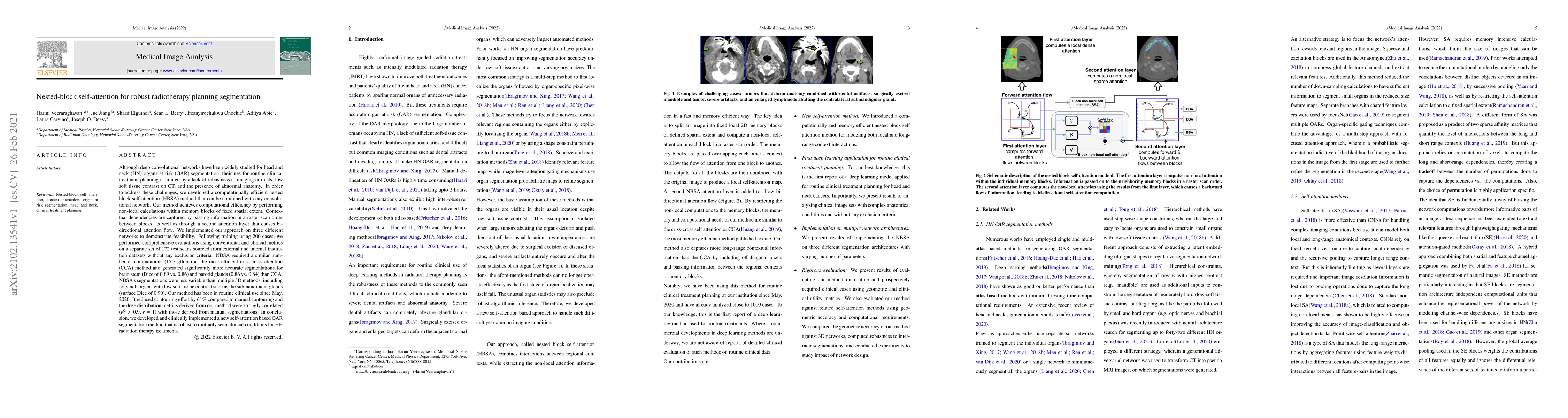Although deep convolutional networks have been widely studied for head and neck (HN) organs at risk (OAR) segmentation, their use for routine clinical treatment planning is limited by a lack of robustness to imaging artifacts, low soft tissue contrast on CT, and the presence of abnormal anatomy. In order to address these challenges, we developed a computationally efficient nested block self-attention (NBSA) method that can be combined with any convolutional network. Our method achieves computational efficiency by performing non-local calculations within memory blocks of fixed spatial extent. Contextual dependencies are captured by passing information in a raster scan order between blocks, as well as through a second attention layer that causes bi-directional attention flow. We implemented our approach on three different networks to demonstrate feasibility. Following training using 200 cases, we performed comprehensive evaluations using conventional and clinical metrics on a separate set of 172 test scans sourced from external and internal institution datasets without any exclusion criteria. NBSA required a similar number of computations (15.7 gflops) as the most efficient criss-cross attention (CCA) method and generated significantly more accurate segmentations for brain stem (Dice of 0.89 vs. 0.86) and parotid glands (0.86 vs. 0.84) than CCA. NBSA's segmentations were less variable than multiple 3D methods, including for small organs with low soft-tissue contrast such as the submandibular glands (surface Dice of 0.90).