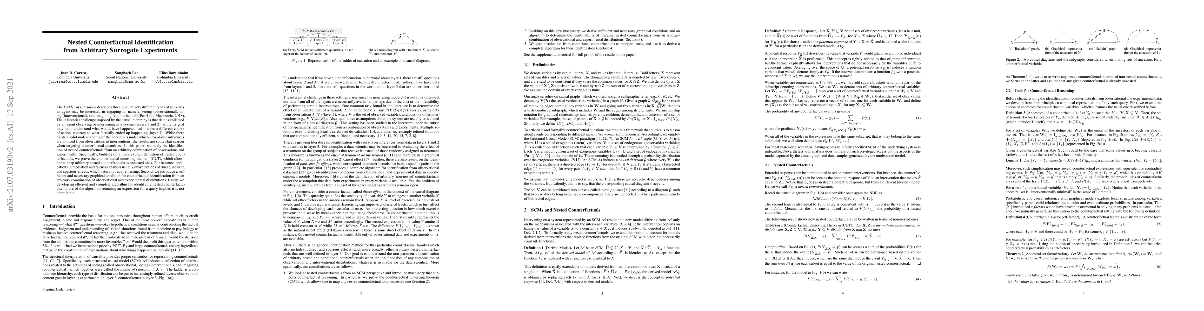 The Ladder of Causation describes three qualitatively different types of activities an agent may be interested in engaging in, namely, seeing (observational), doing (interventional), and imagining (counterfactual) (Pearl and Mackenzie, 2018). The inferential challenge imposed by the causal hierarchy is that data is collected by an agent observing or intervening in a system (layers 1 and 2), while its goal may be to understand what would have happened had it taken a different course of action, contrary to what factually ended up happening (layer 3). While there exists a solid understanding of the conditions under which cross-layer inferences are allowed from observations to interventions, the results are somewhat scarcer when targeting counterfactual quantities. In this paper, we study the identification of nested counterfactuals from an arbitrary combination of observations and experiments. Specifically, building on a more explicit definition of nested counterfactuals, we prove the counterfactual unnesting theorem (CUT), which allows one to map arbitrary nested counterfactuals to unnested ones. For instance, applications in mediation and fairness analysis usually evoke notions of direct, indirect, and spurious effects, which naturally require nesting. Second, we introduce a sufficient and necessary graphical condition for counterfactual identification from an arbitrary combination of observational and experimental distributions. Lastly, we develop an efficient and complete algorithm for identifying nested counterfactuals; failure of the algorithm returning an expression for a query implies it is not identifiable.