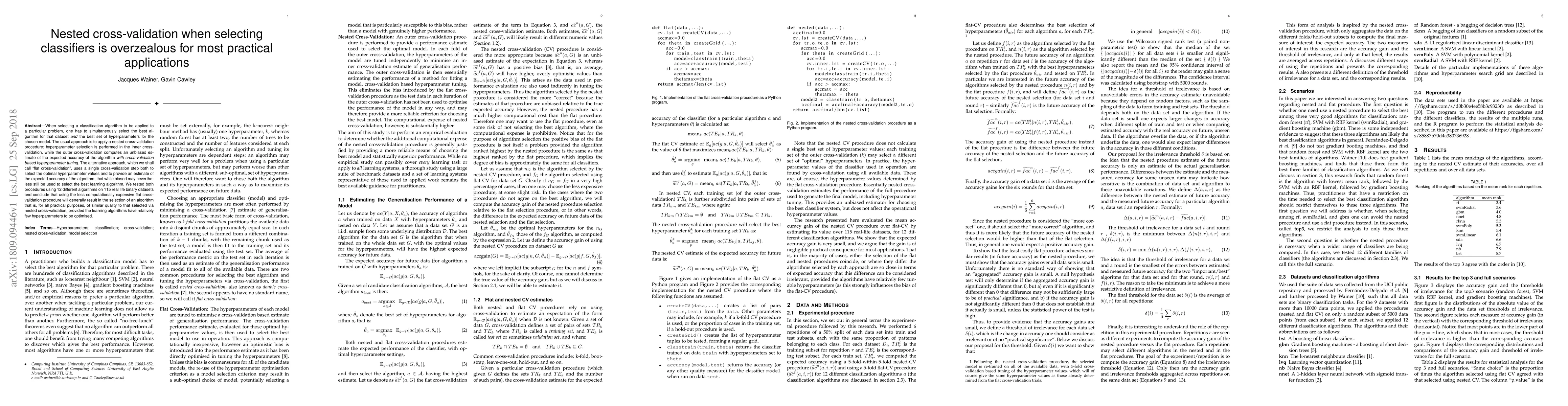 The paper argues that nested cross-validation is often overzealous for practical applications, finding that flat cross-validation, which is less computationally intensive, generally selects classifiers of similar quality. The study tested 12 algorithms on 115 datasets, concluding that flat cross-validation is preferable when algorithms have few hyperparameters.