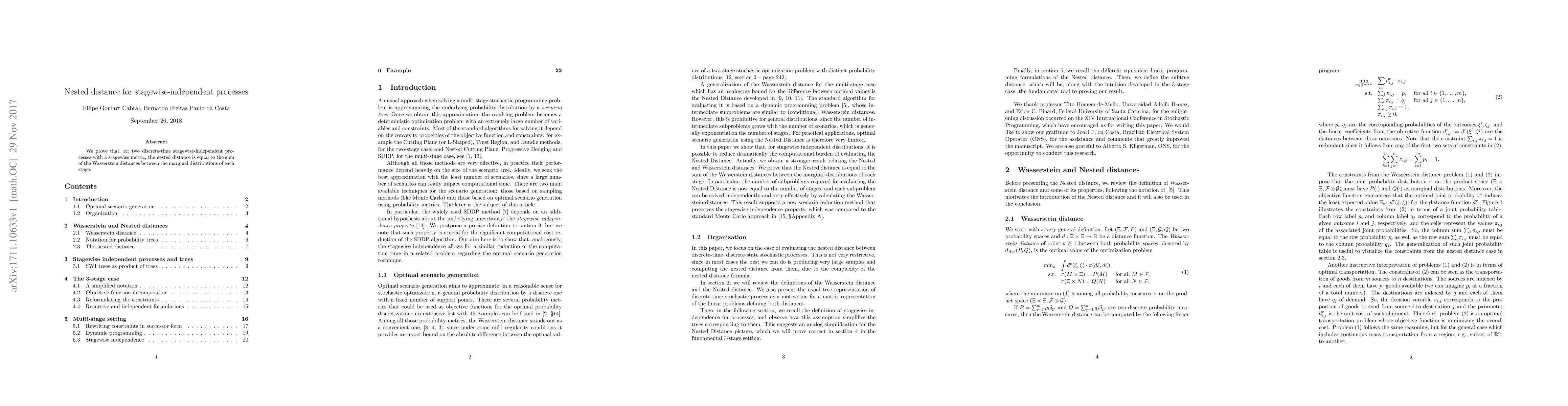 Summary: The paper establishes that the nested distance for two discrete-time stagewise-independent processes equals the sum of Wasserstein distances between their marginal distributions at each stage. This provides a new metric for analyzing such processes.