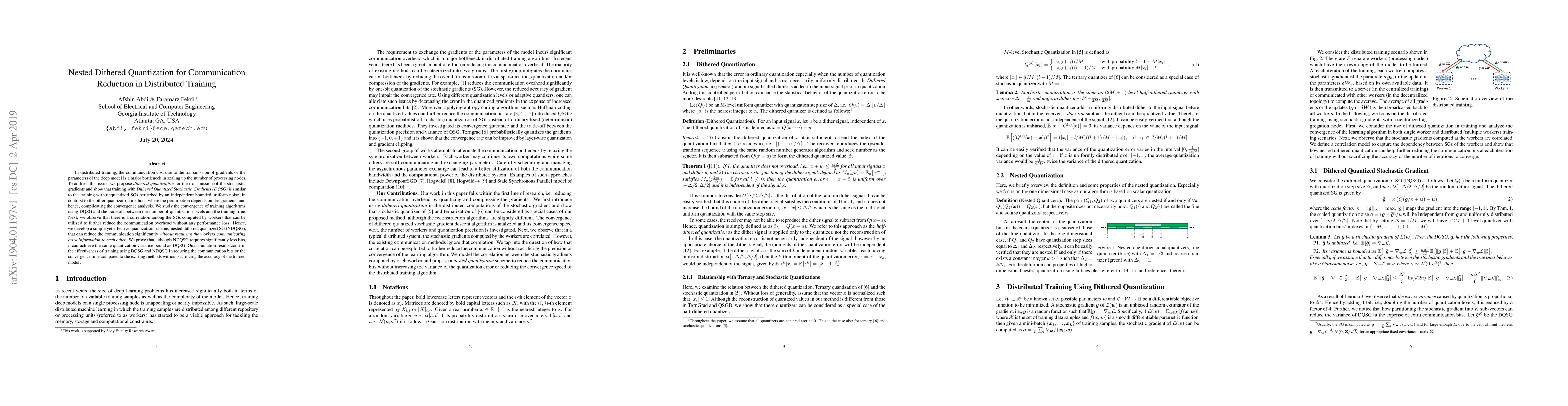 This paper proposes dithered quantization and nested dithered quantization methods to reduce communication costs in distributed training by transmitting quantized stochastic gradients. The nested approach further reduces communication without performance loss, achieving similar quantization variance to dithered quantization while requiring fewer bits.